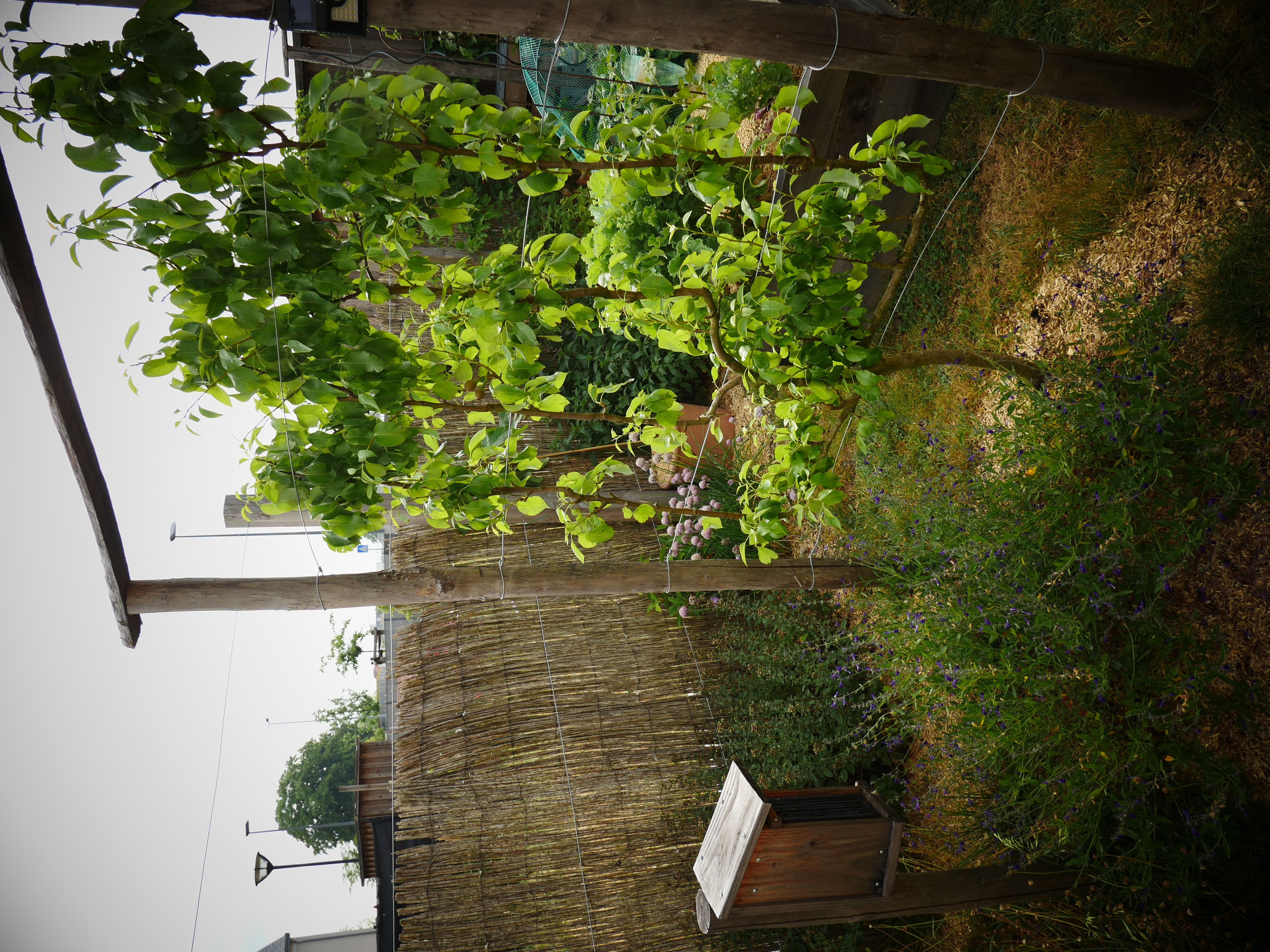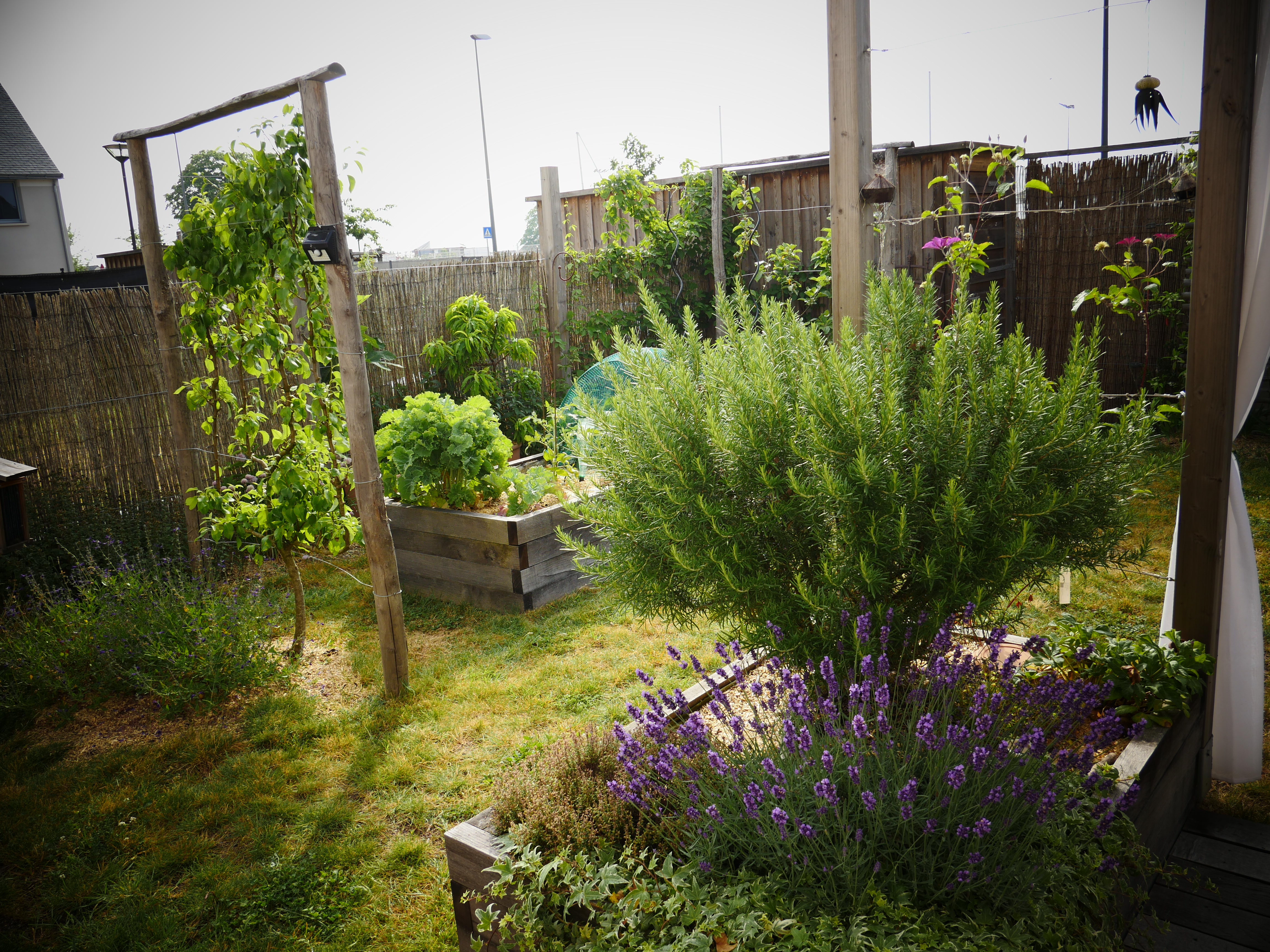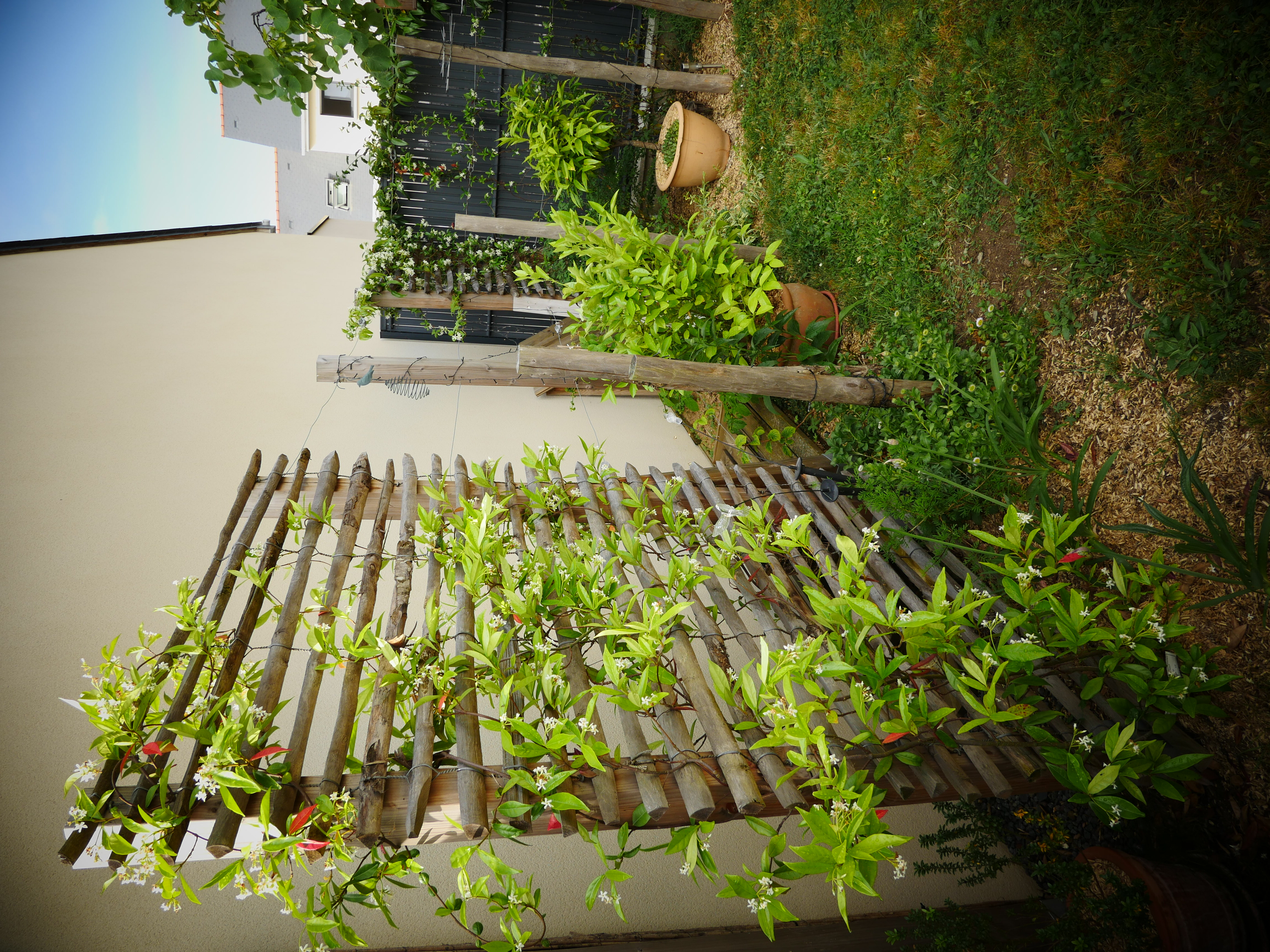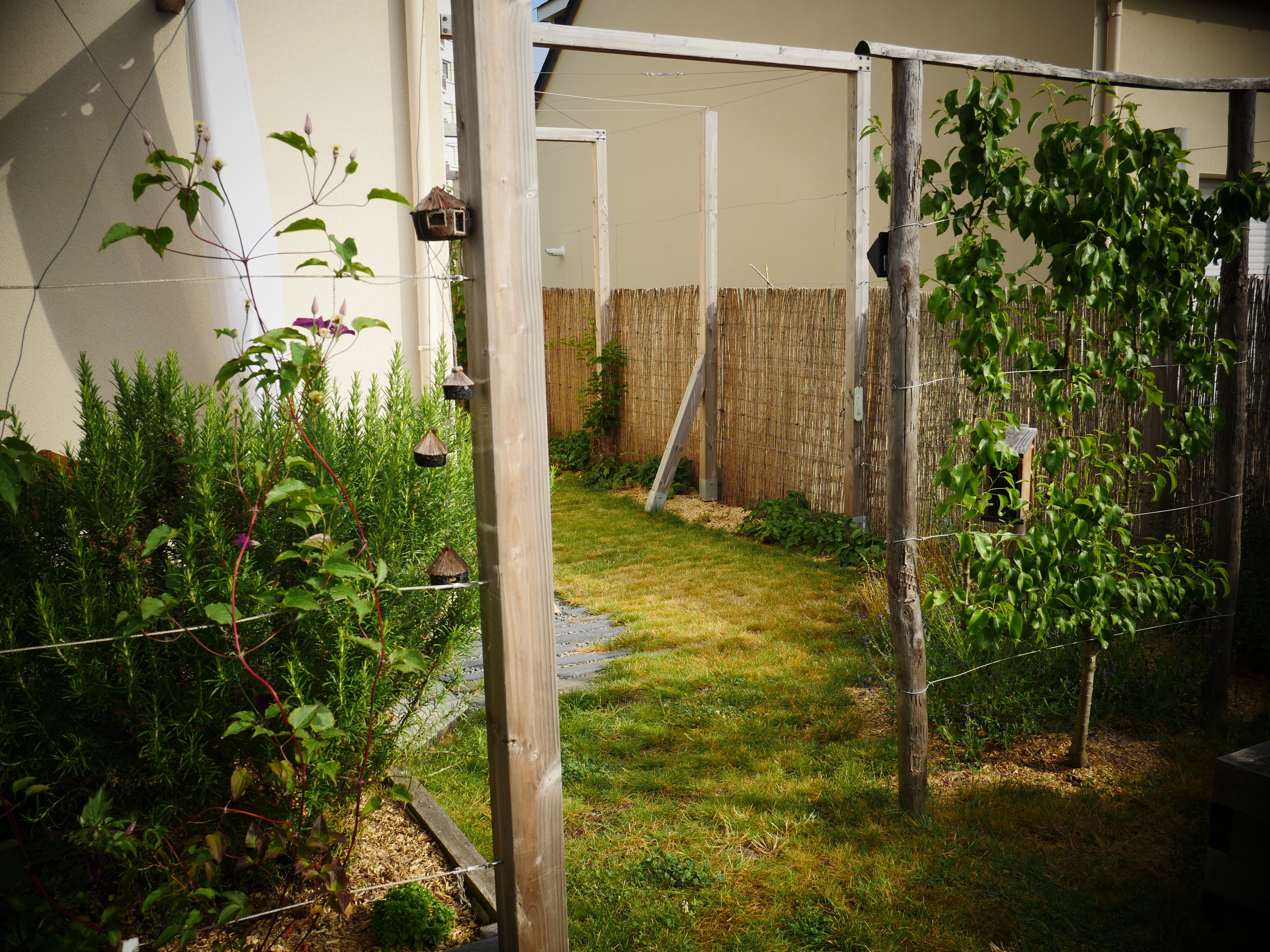 Ce petit jardin se découvre en traversant un corridor végétalisé à l’aide d’une succession d’arches en bois, cadrant une perspective vers le jardin arrière. La terrasse surmontée d’une pergola compose un espace de détente niché au coeur de la végétation. Le jardin est rythmé par des structures en bois supports de grimpantes, nichoirs et autres refuges à insectes. La note comestible de la palette végétale est soulignée par des bacs potager et des arbres fruitiers en palmettes.