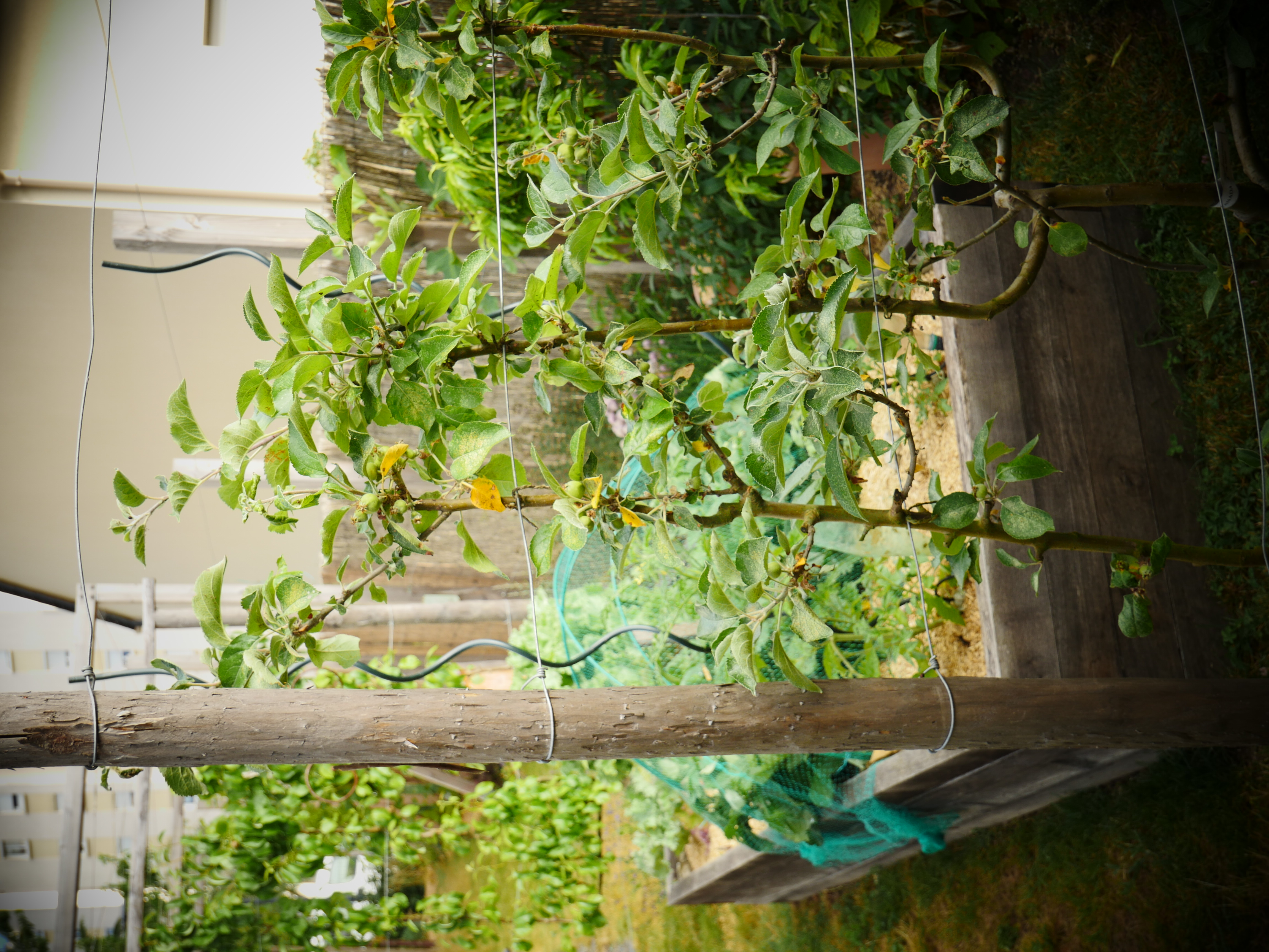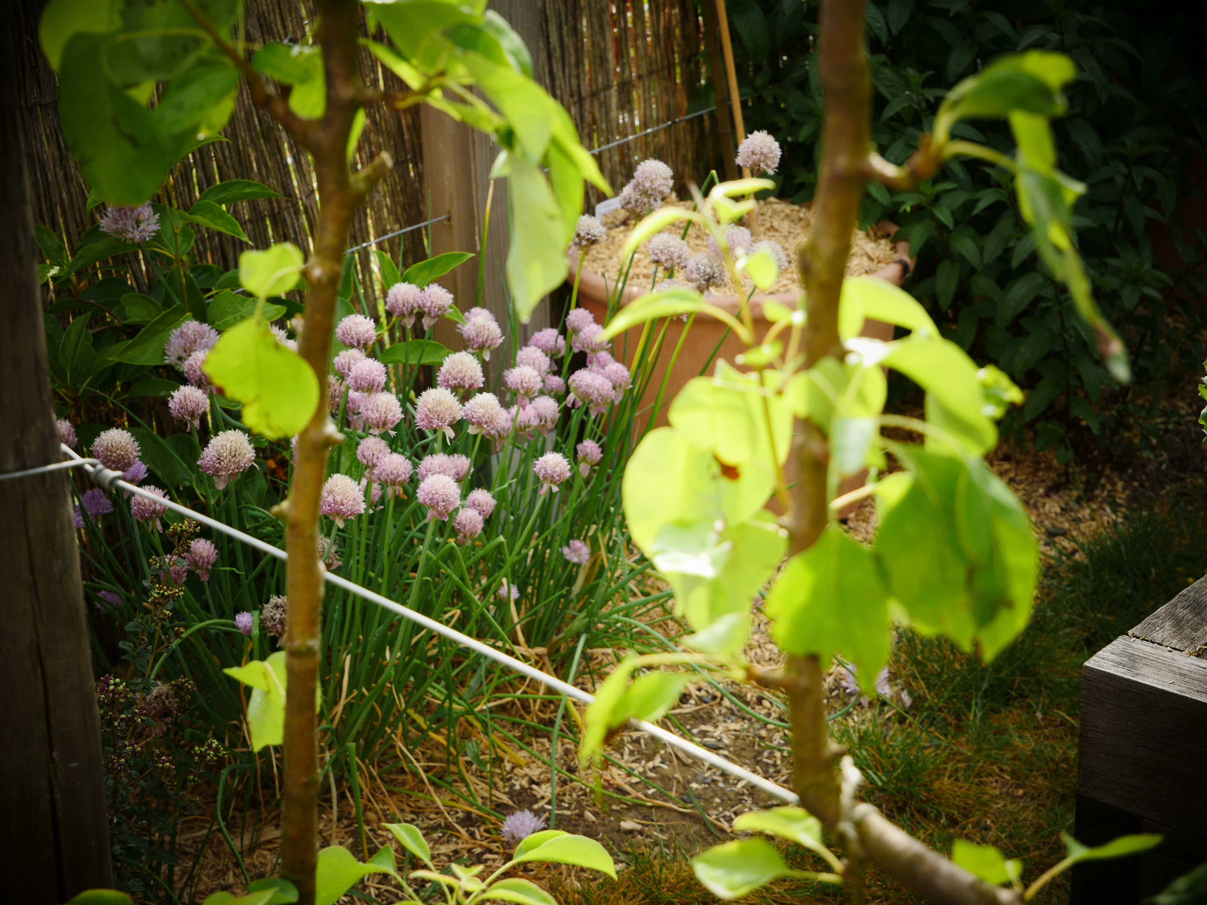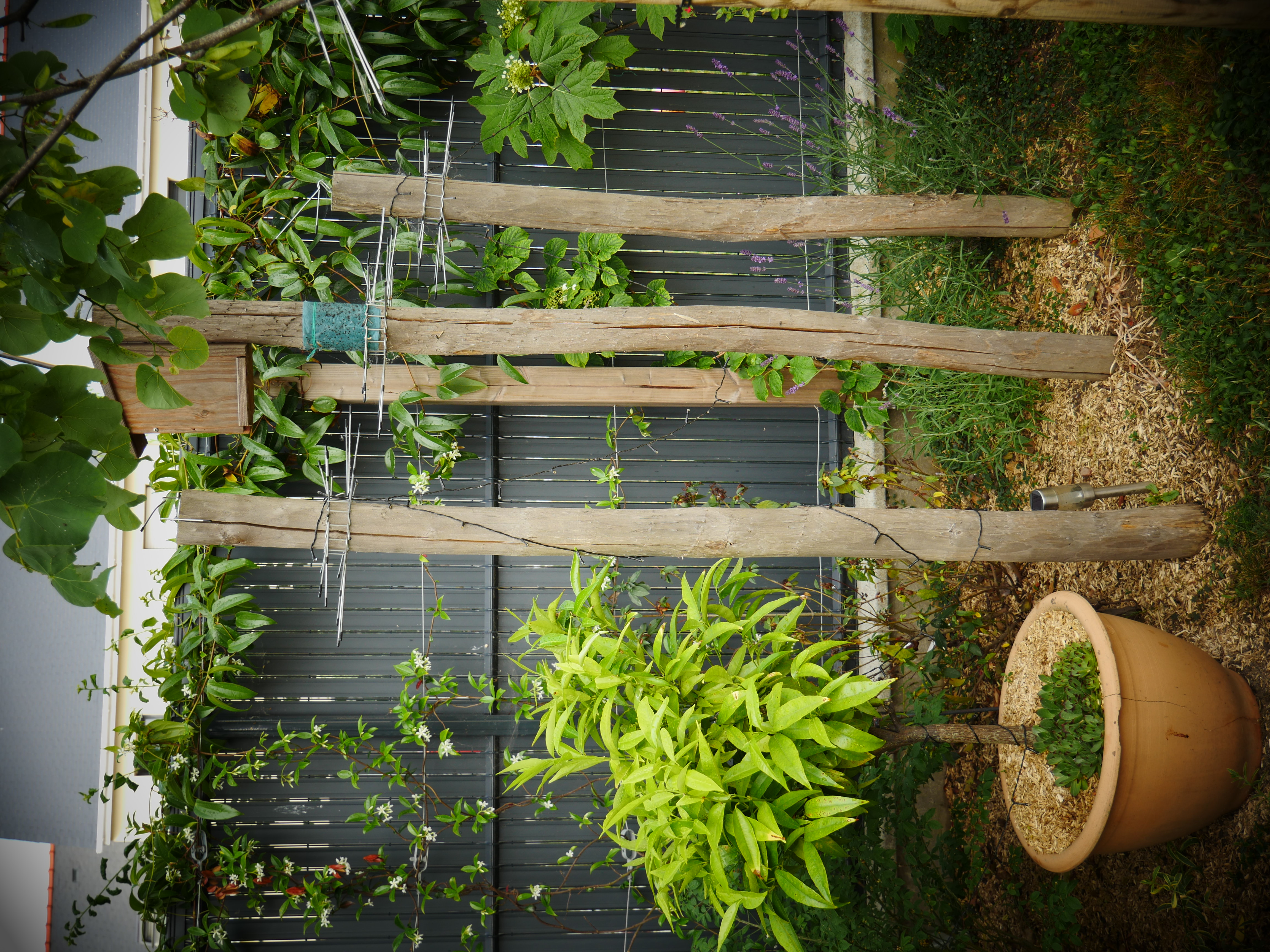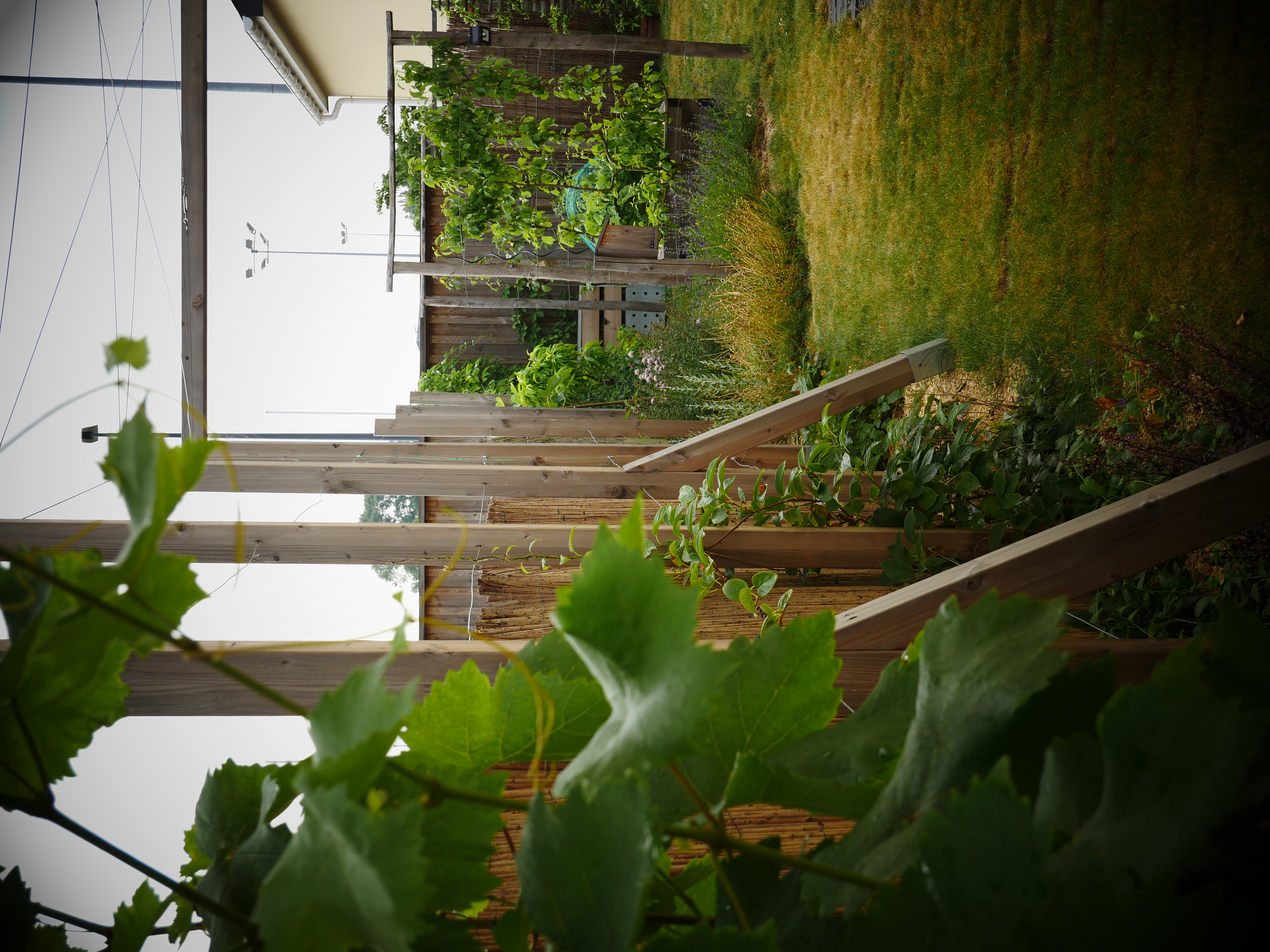 Ce petit jardin se découvre en traversant un corridor végétalisé à l’aide d’une succession d’arches en bois, cadrant une perspective vers le jardin arrière. La terrasse surmontée d’une pergola compose un espace de détente niché au coeur de la végétation. Le jardin est rythmé par des structures en bois supports de grimpantes, nichoirs et autres refuges à insectes. La note comestible de la palette végétale est soulignée par des bacs potager et des arbres fruitiers en palmettes.