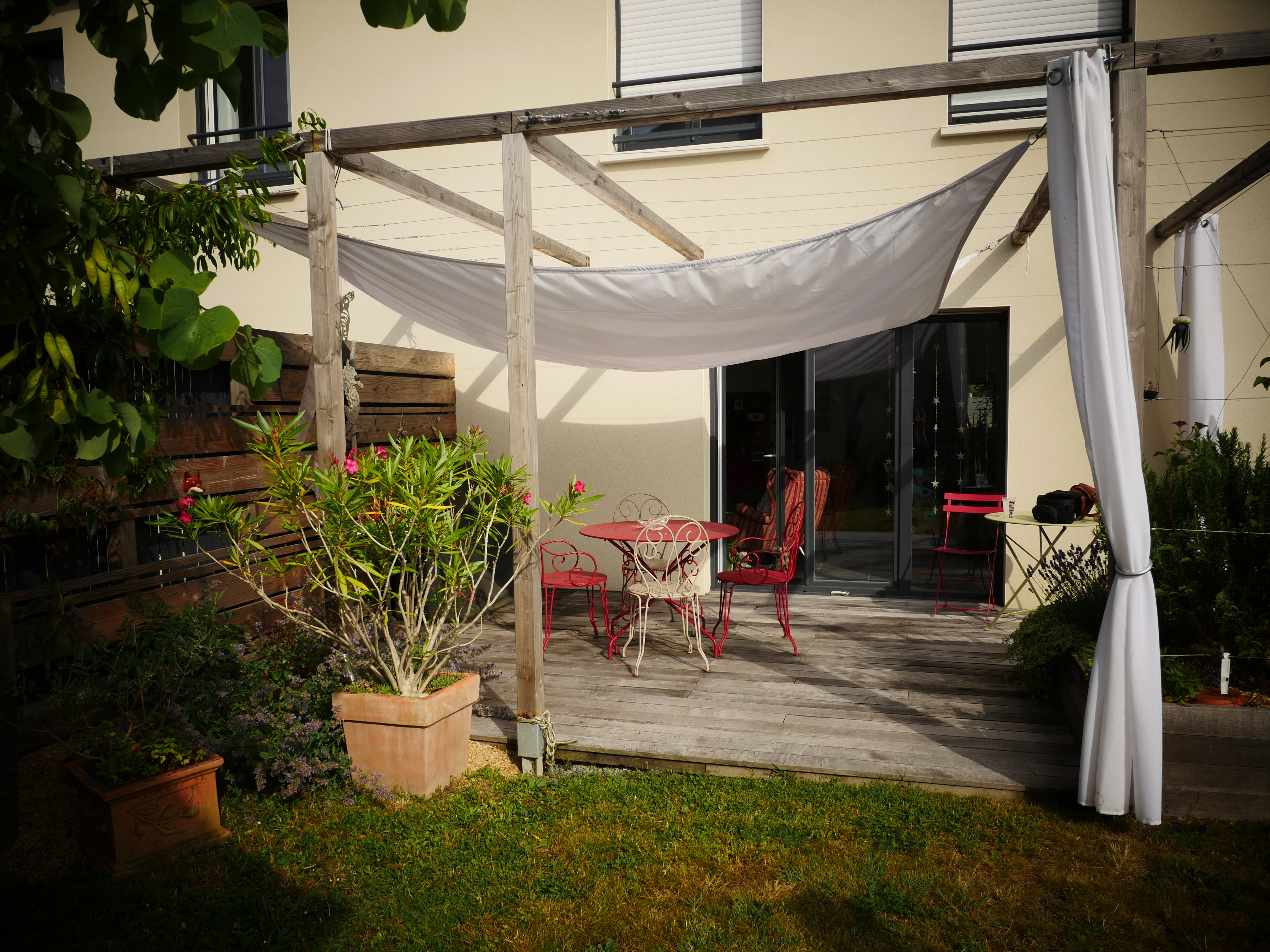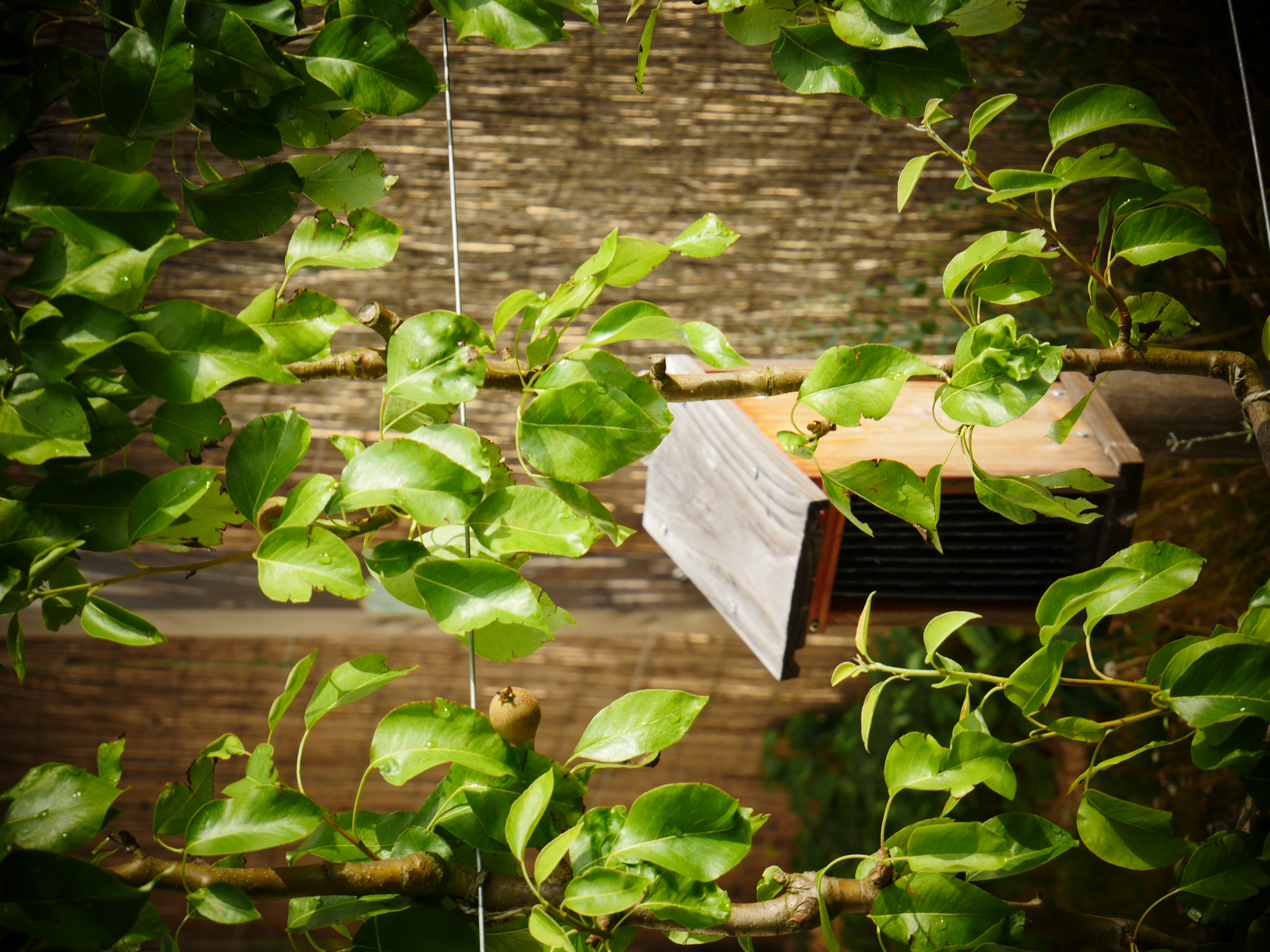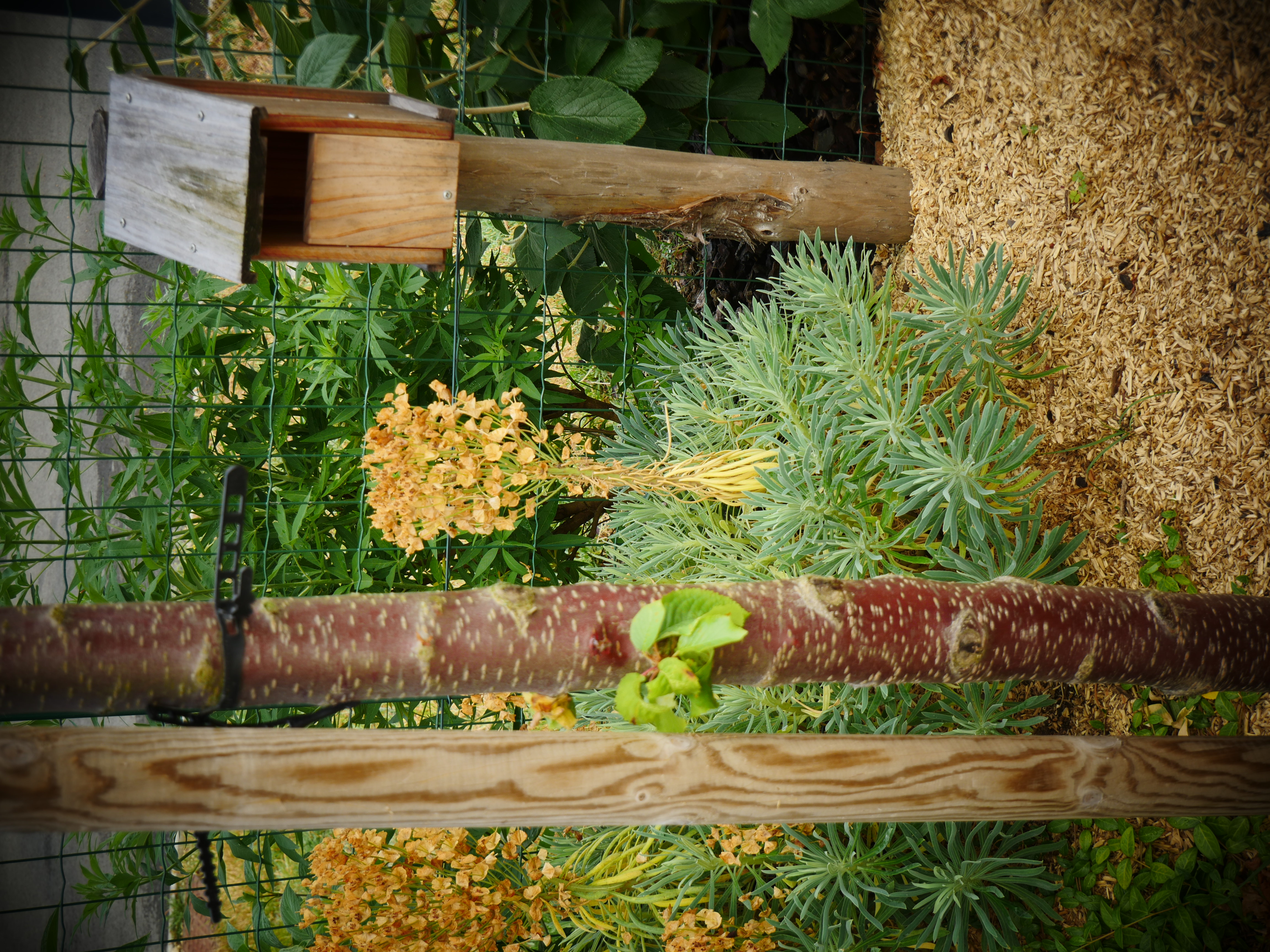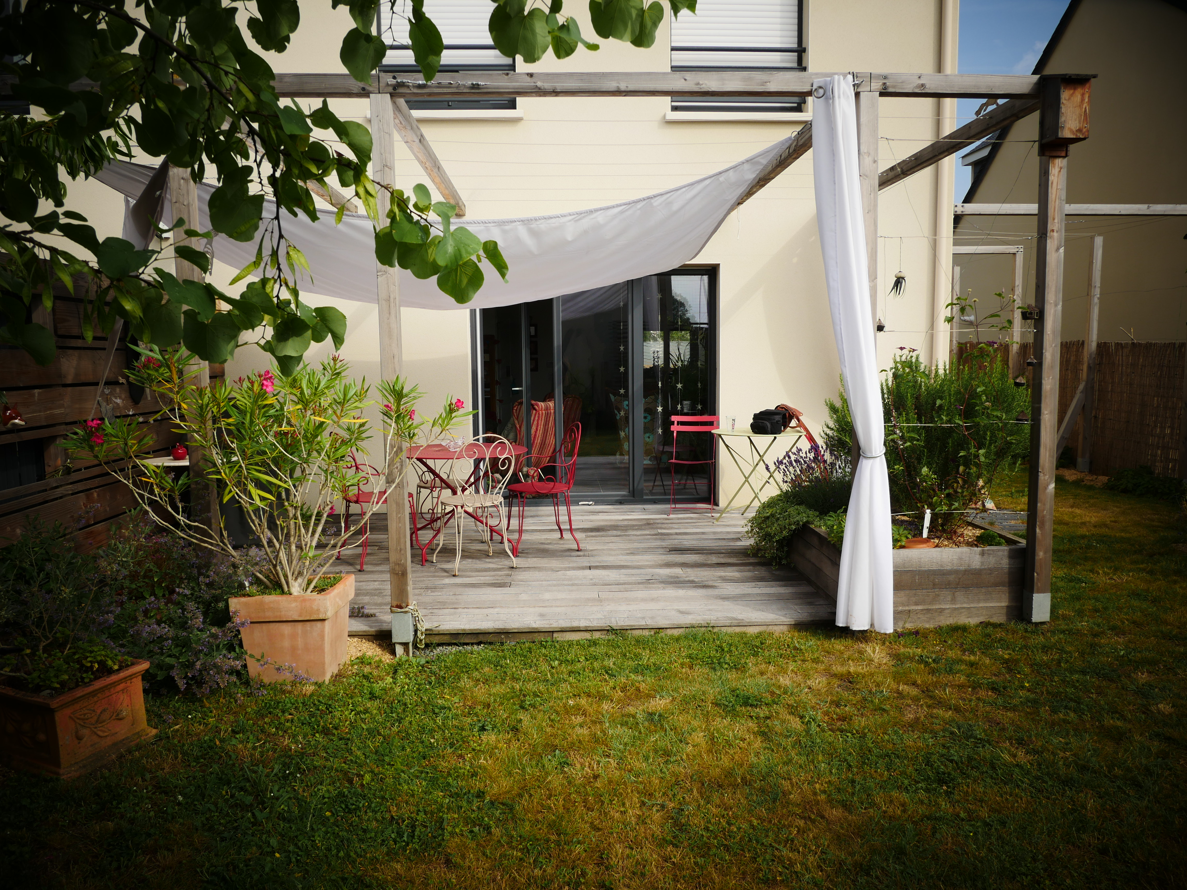 Ce petit jardin se découvre en traversant un corridor végétalisé à l’aide d’une succession d’arches en bois, cadrant une perspective vers le jardin arrière. La terrasse surmontée d’une pergola compose un espace de détente niché au coeur de la végétation. Le jardin est rythmé par des structures en bois supports de grimpantes, nichoirs et autres refuges à insectes. La note comestible de la palette végétale est soulignée par des bacs potager et des arbres fruitiers en palmettes.