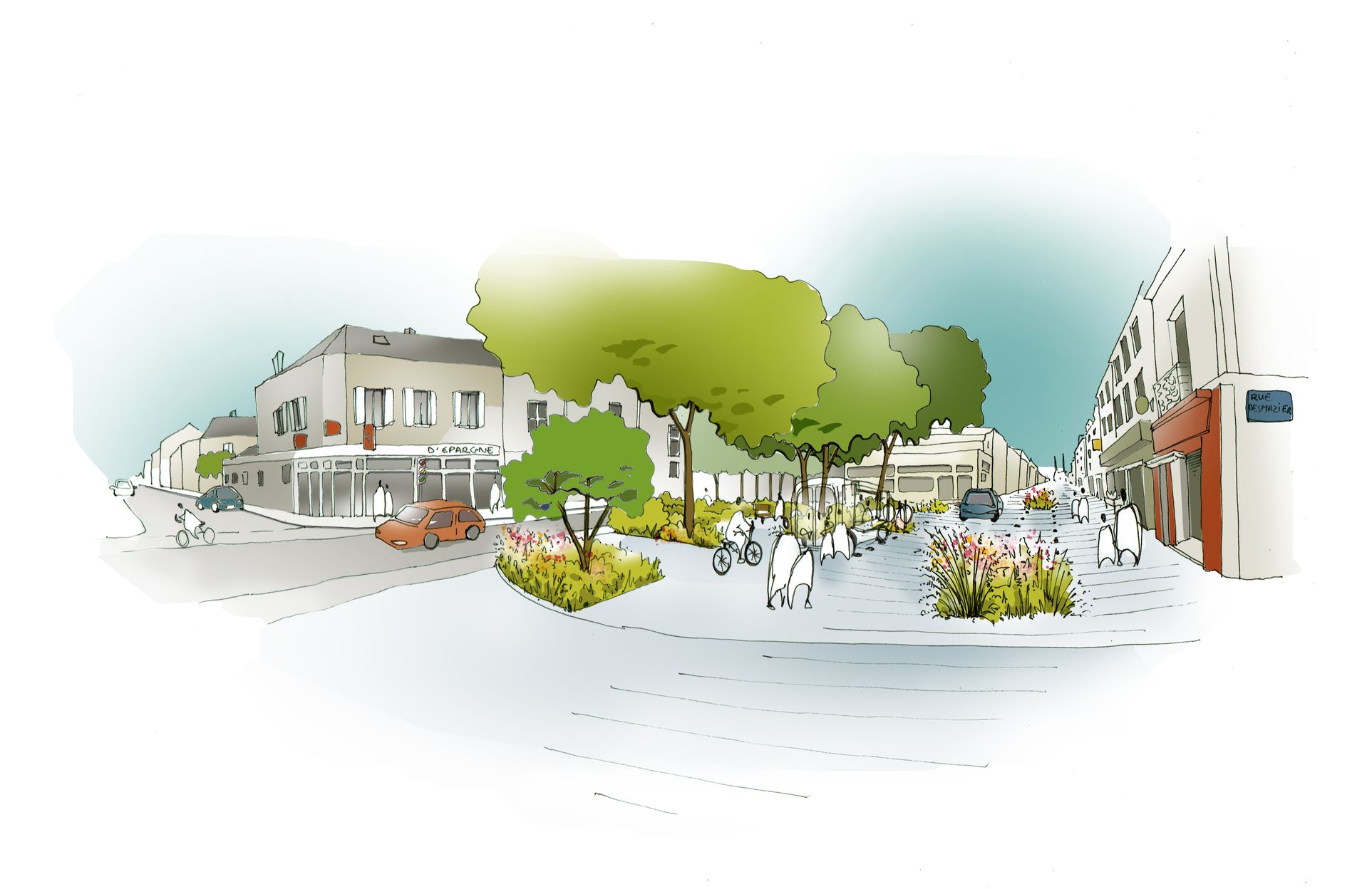 Une attention particulière est portée sur la Place de la Madeleine et le parvis de l’église pour redonner une identité forte au quartier et un cadre agréable pour les habitants et autres passagers. Une continuité entre les places sera créée par le végétal, invitant la biodiversité au cœur du projet.