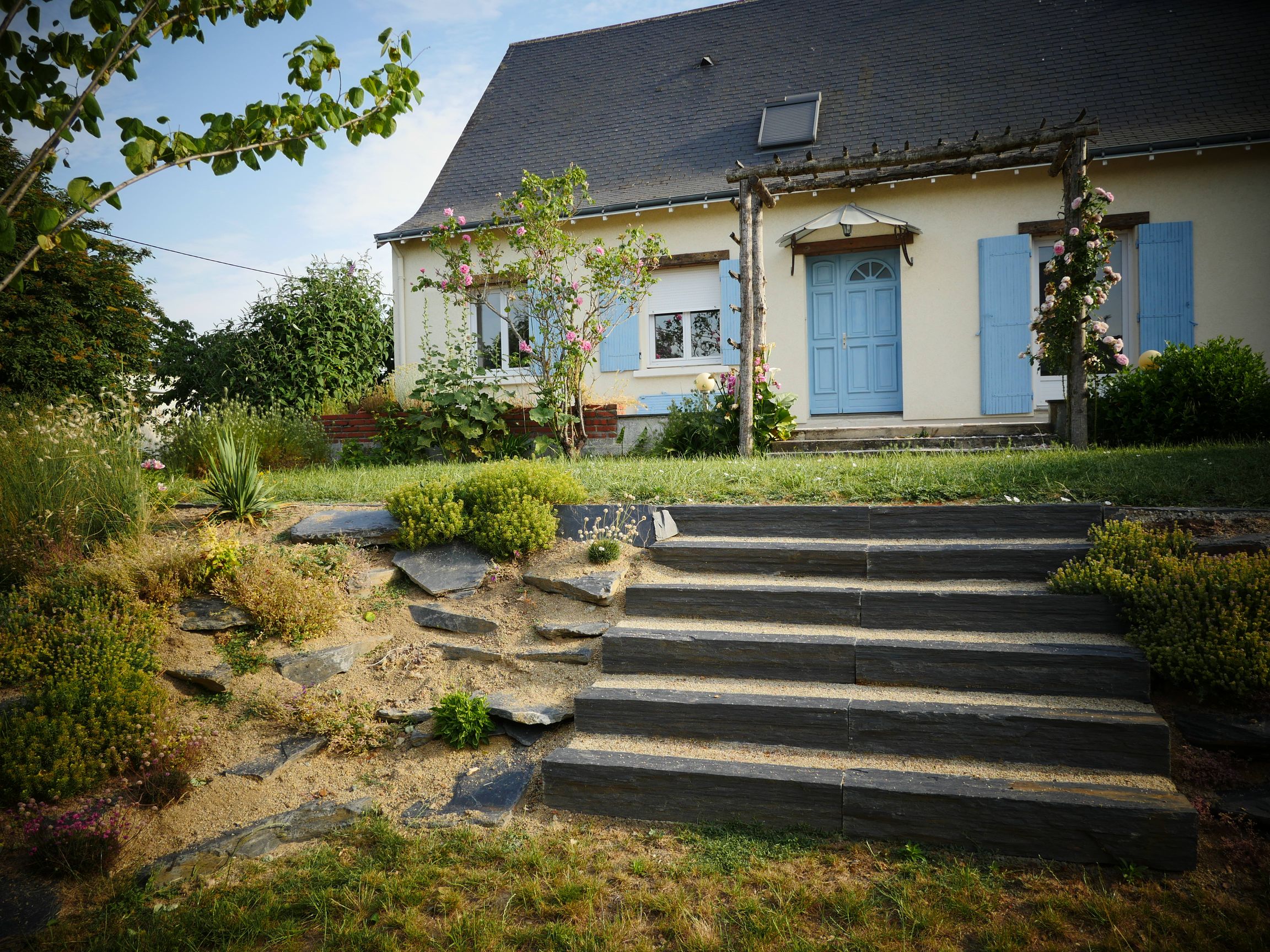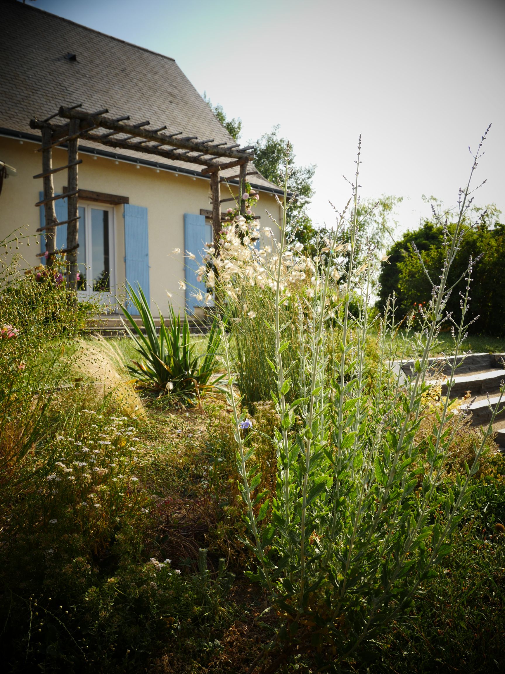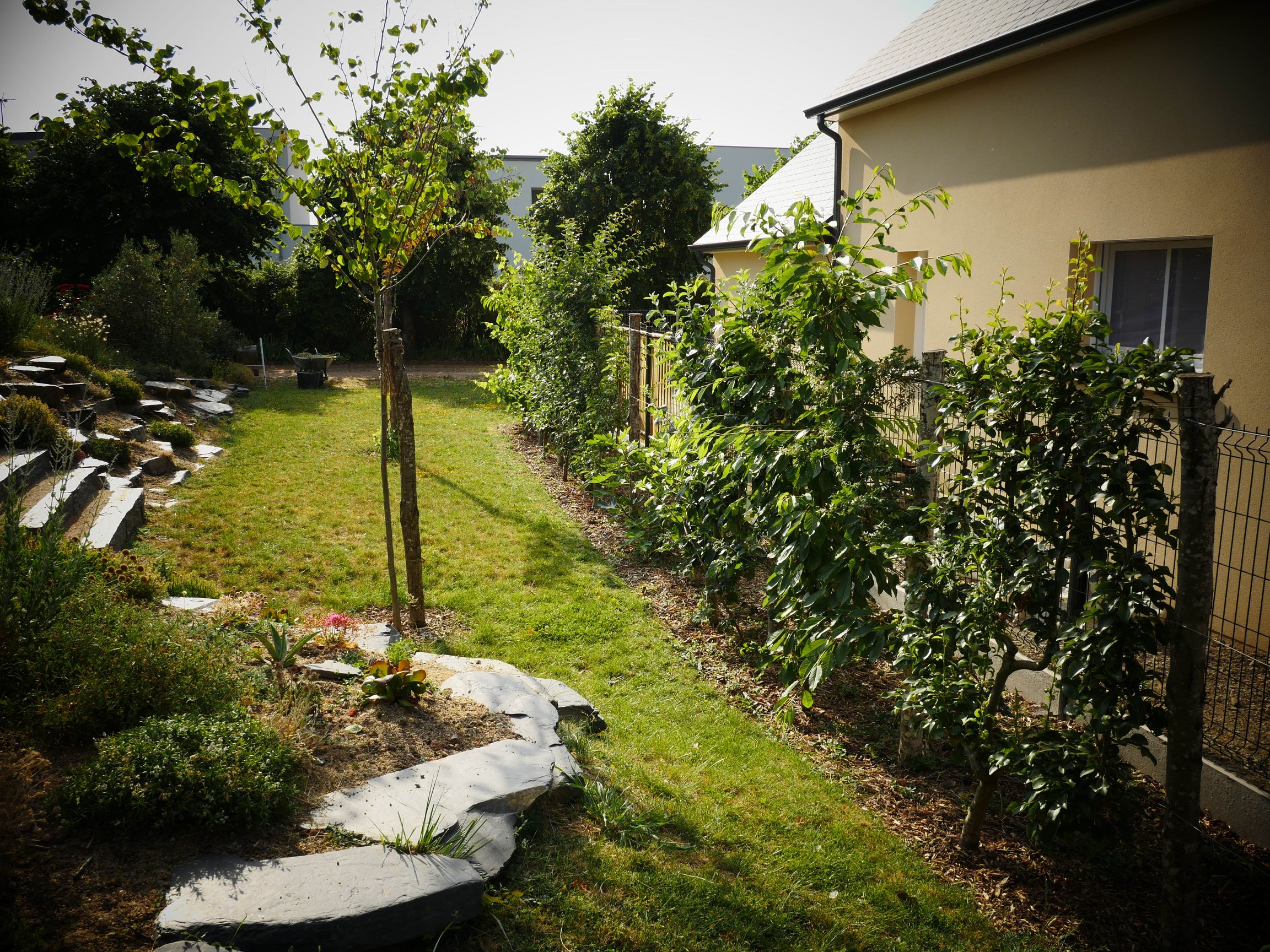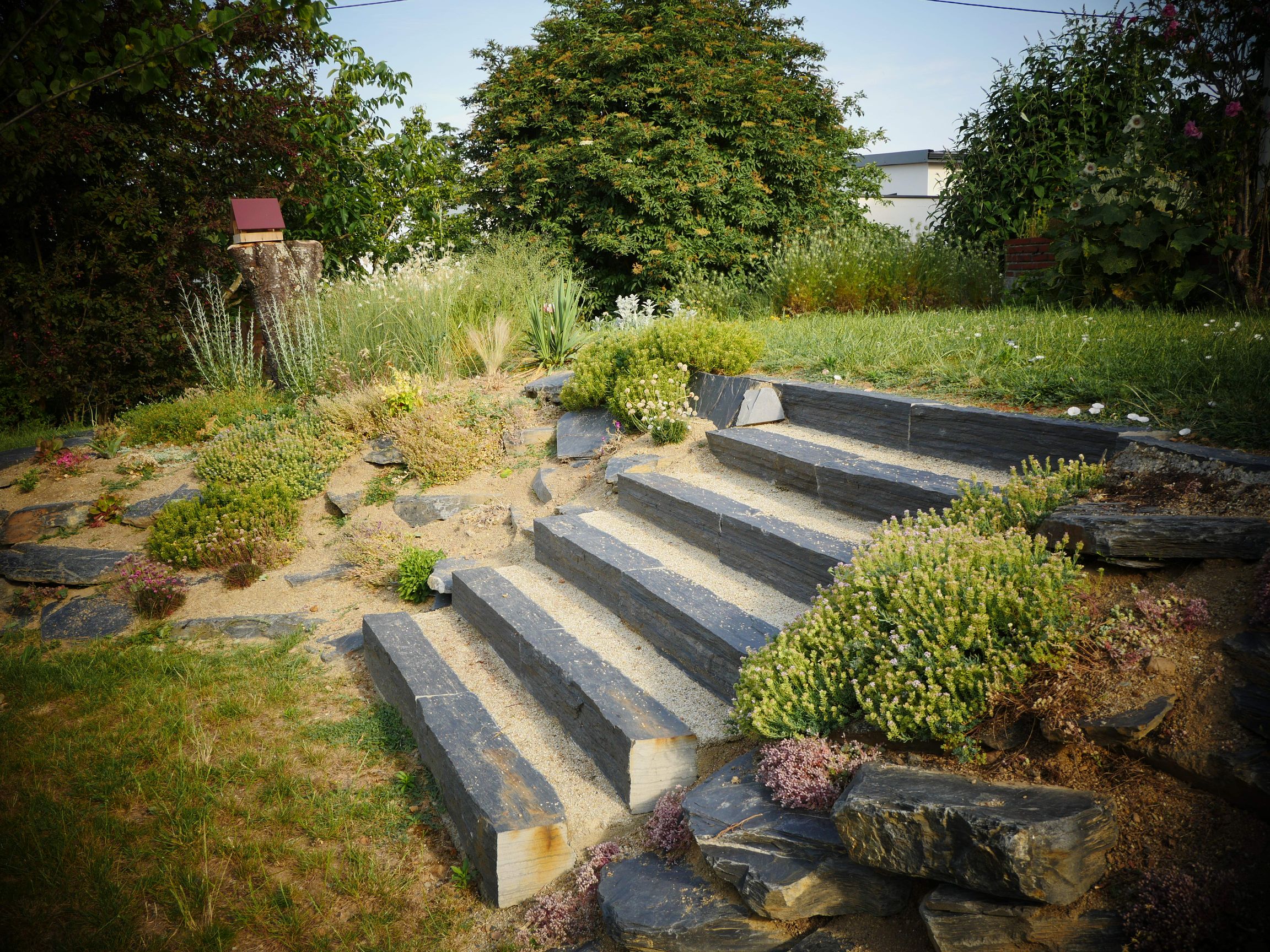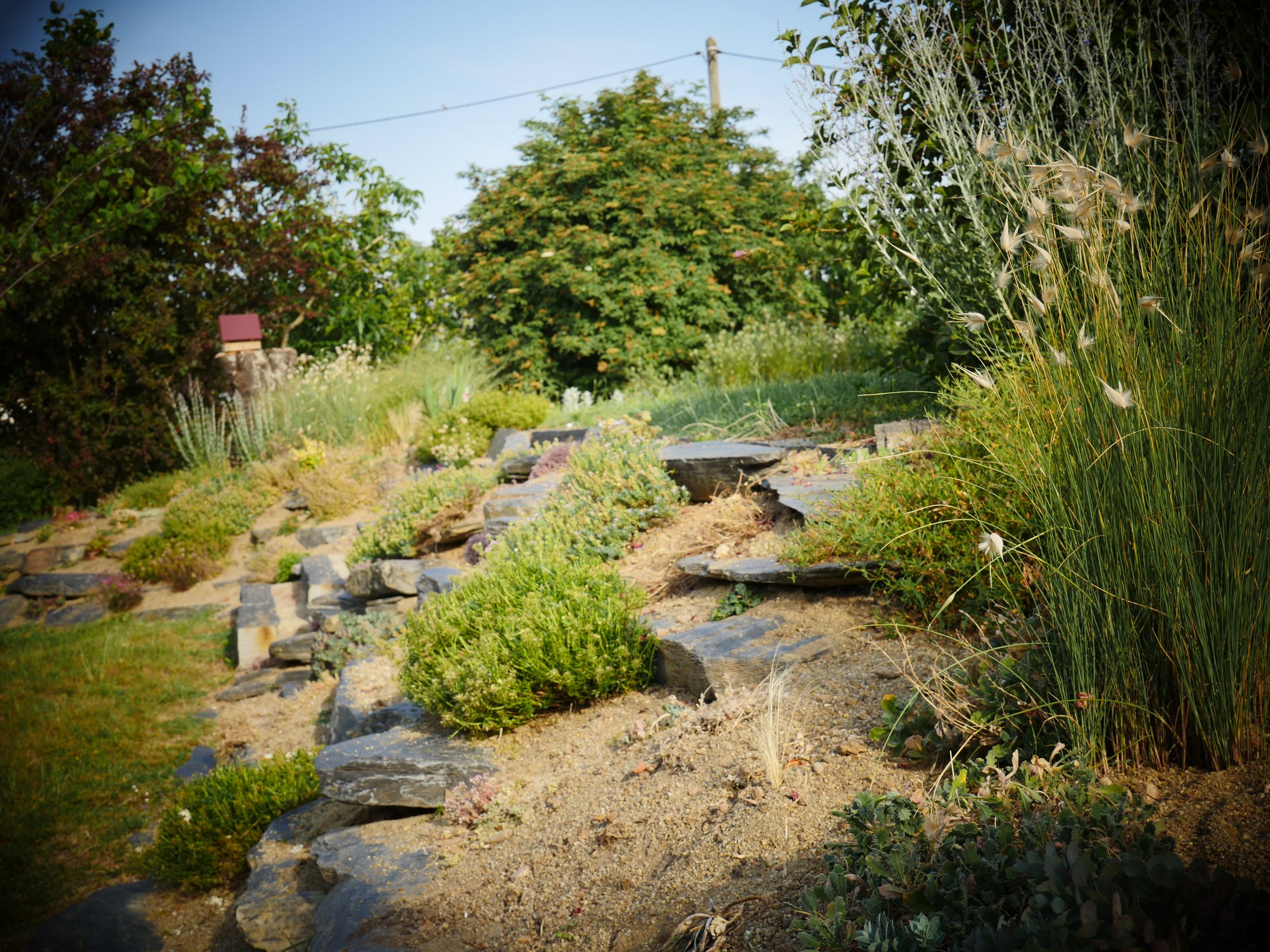 Perchée en haut du terrain, la maison domine ce jardin constitué de terrasses successives. La terrasse haute est simplement enherbée, cadrée par une arche végétalisée de rosiers. Dans ce même axe, un escalier d’ardoise permet d’atteindre en bas le verger palissé. Entre ces deux espaces, une rocaille d’ardoise accueille une végétation fleurie mellifère aux couleurs harmonieuses.