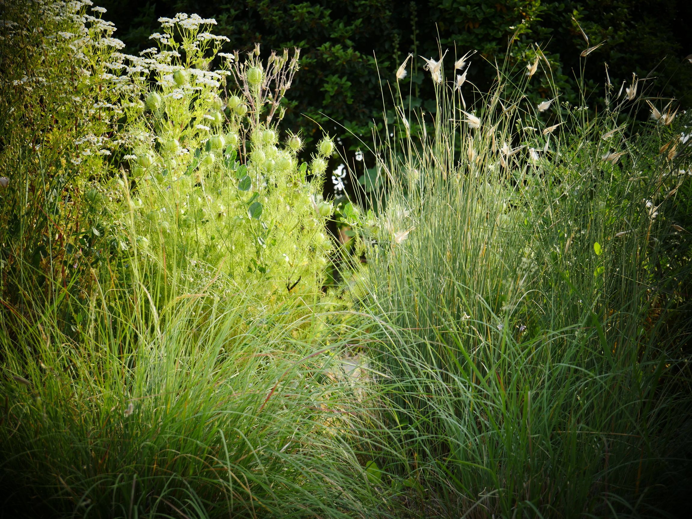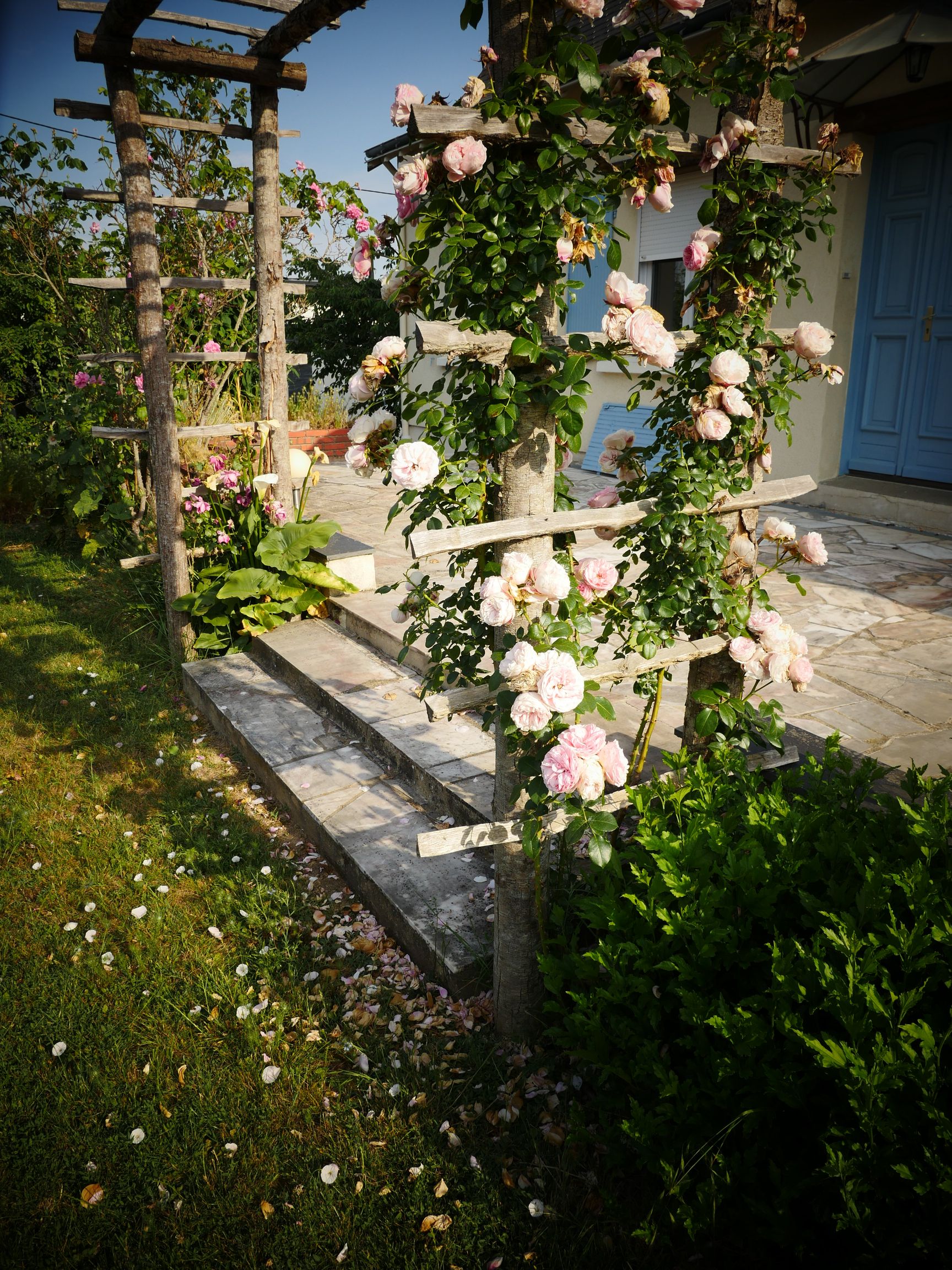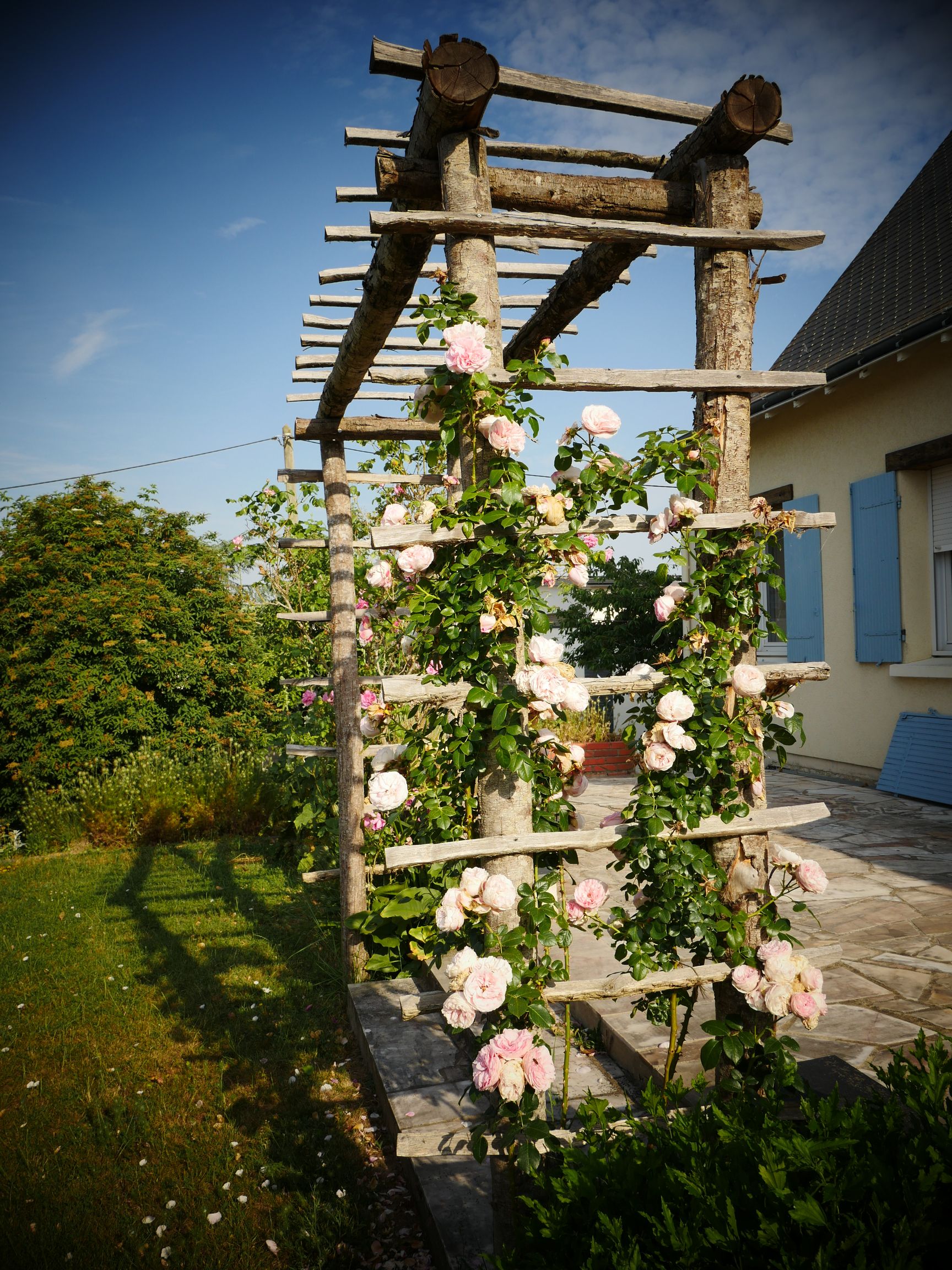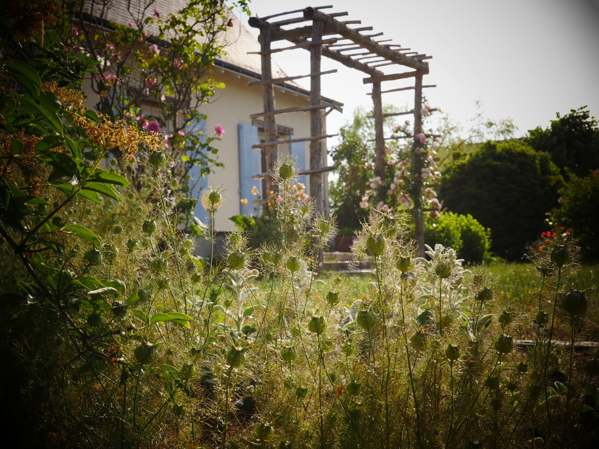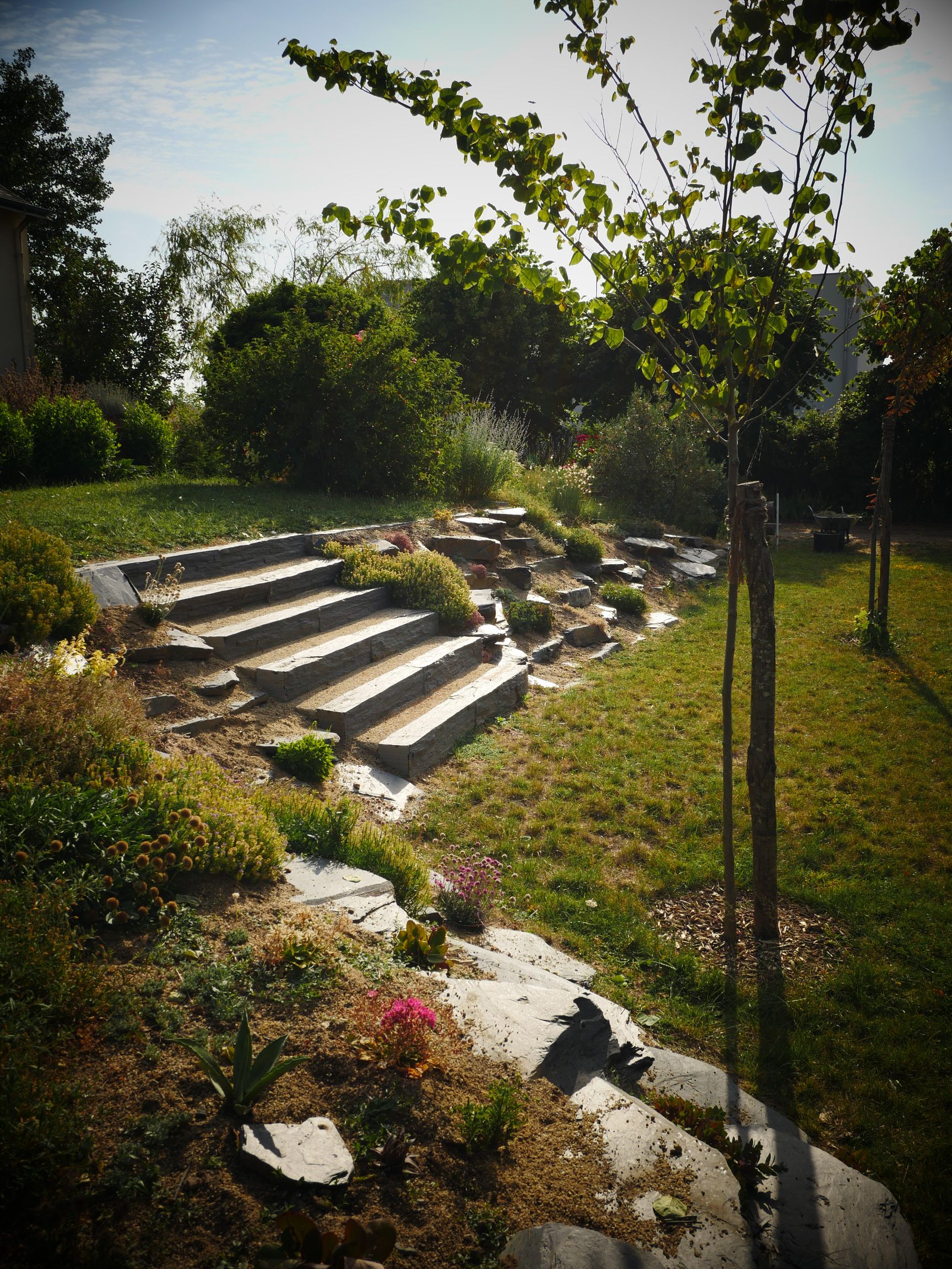 Perchée en haut du terrain, la maison domine ce jardin constitué de terrasses successives. La terrasse haute est simplement enherbée, cadrée par une arche végétalisée de rosiers. Dans ce même axe, un escalier d’ardoise permet d’atteindre en bas le verger palissé. Entre ces deux espaces, une rocaille d’ardoise accueille une végétation fleurie mellifère aux couleurs harmonieuses.