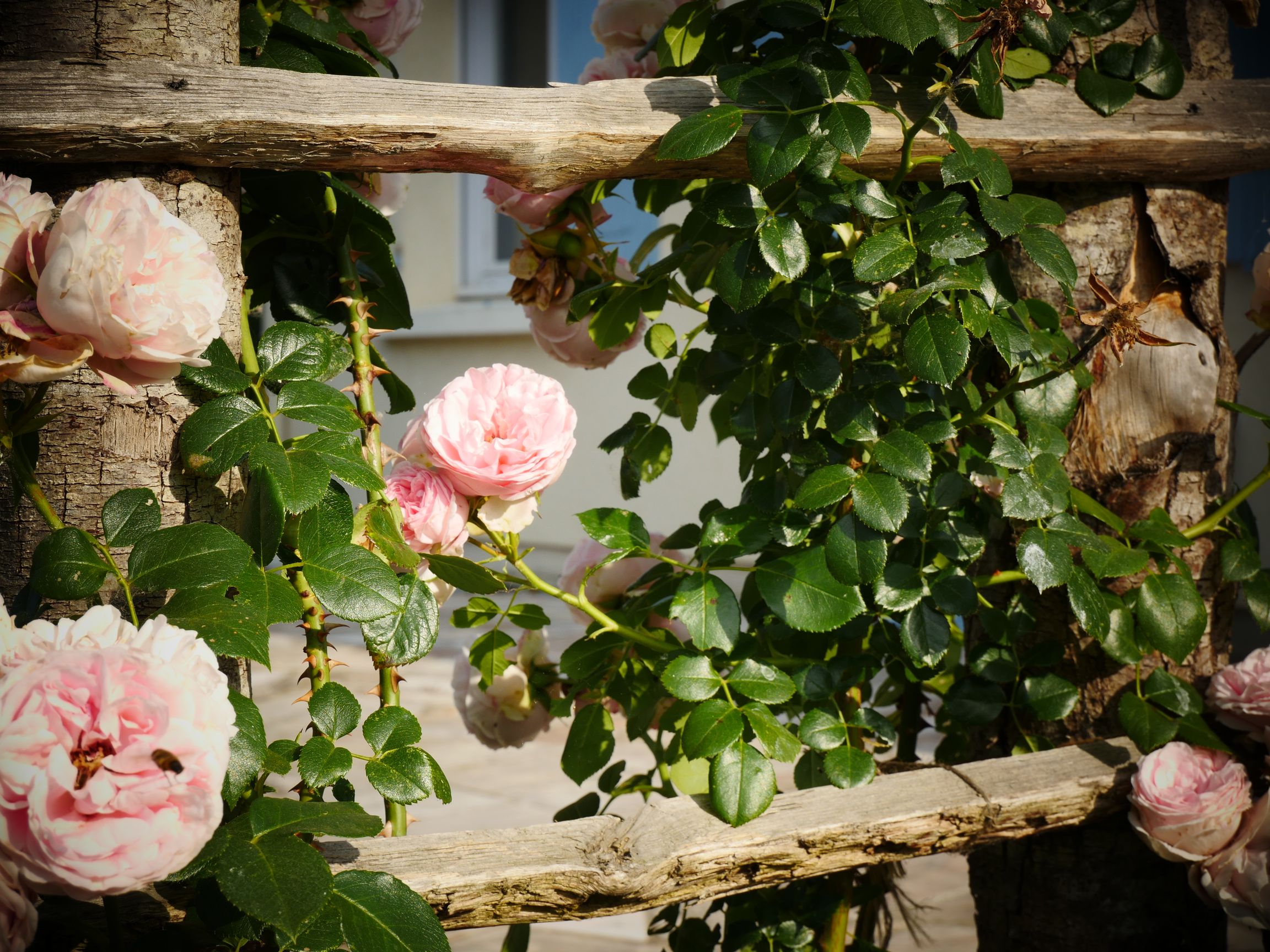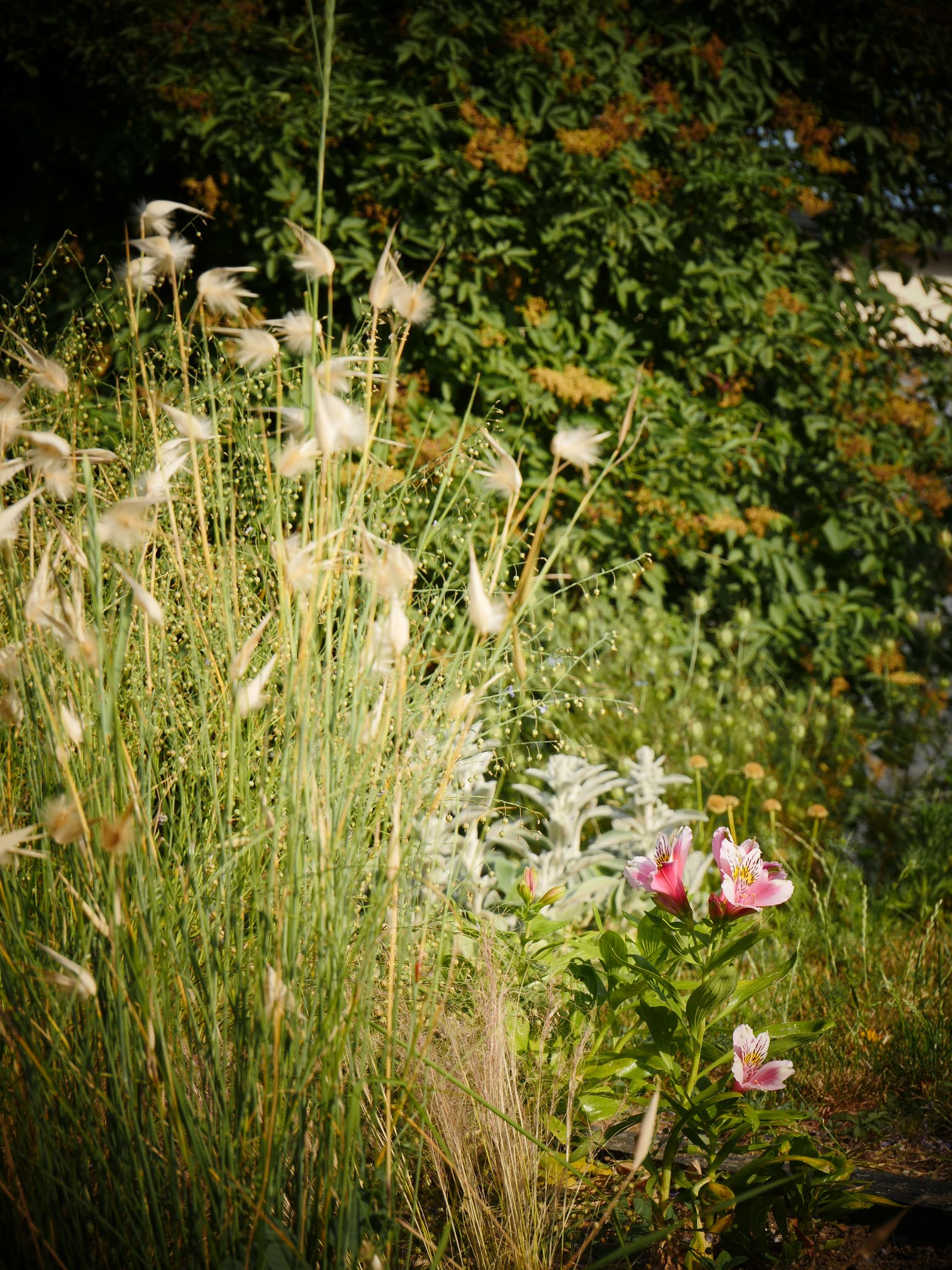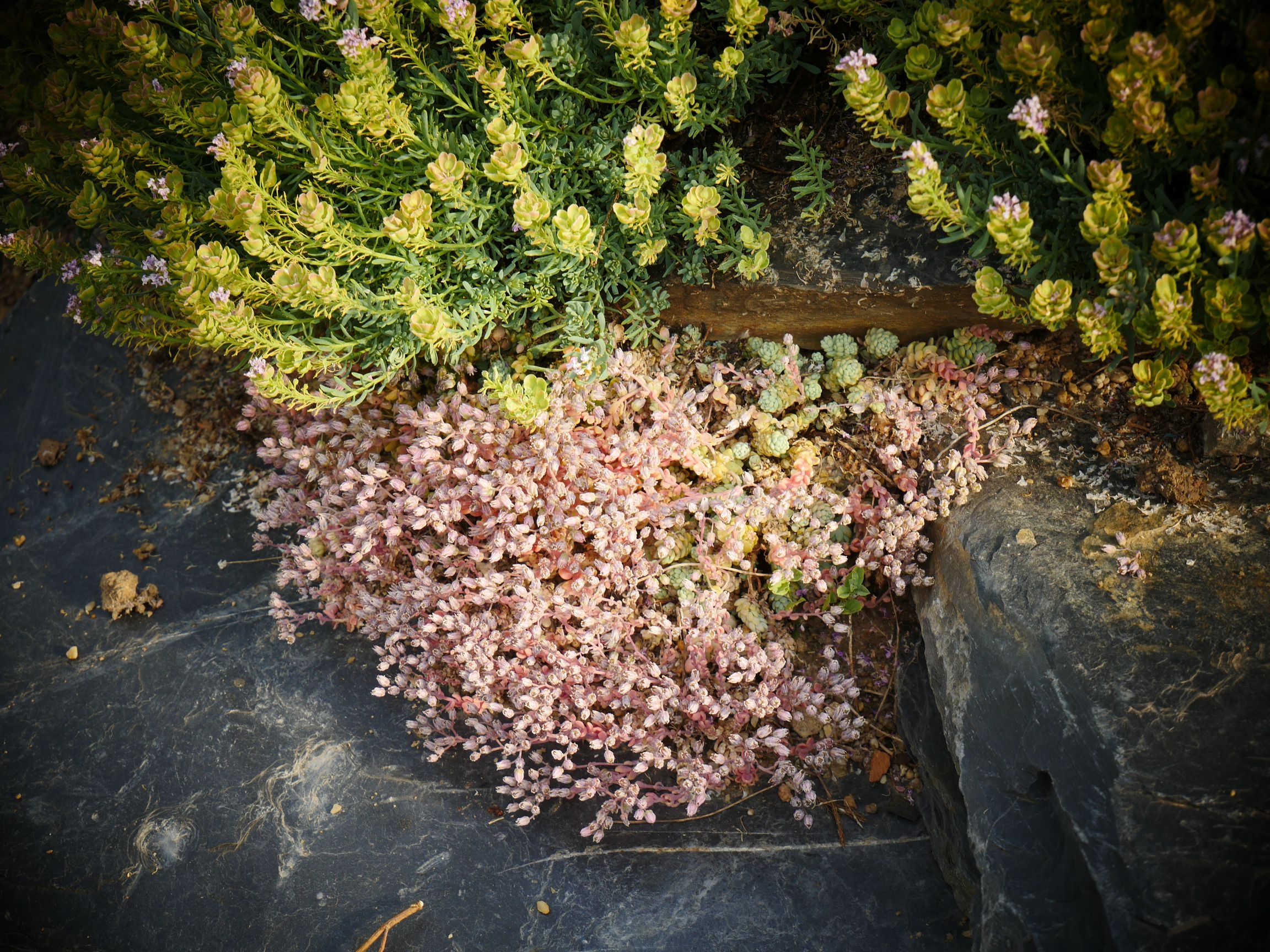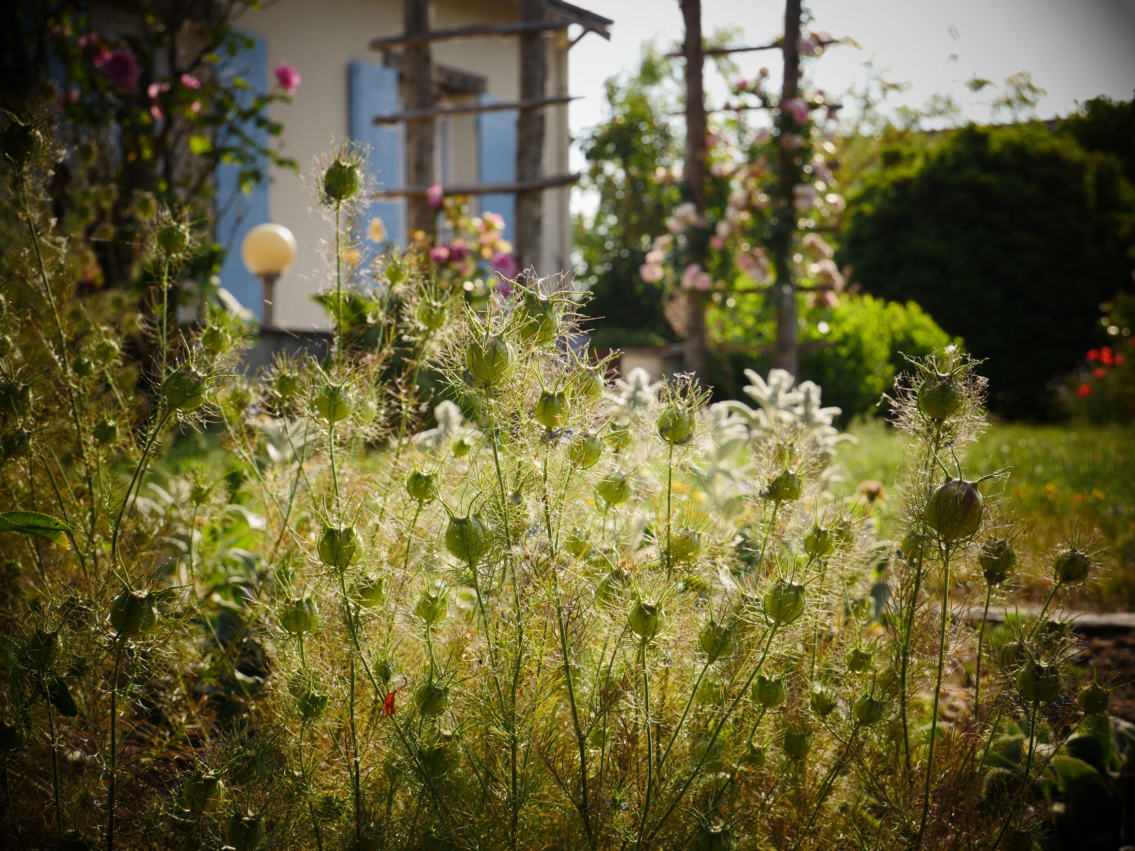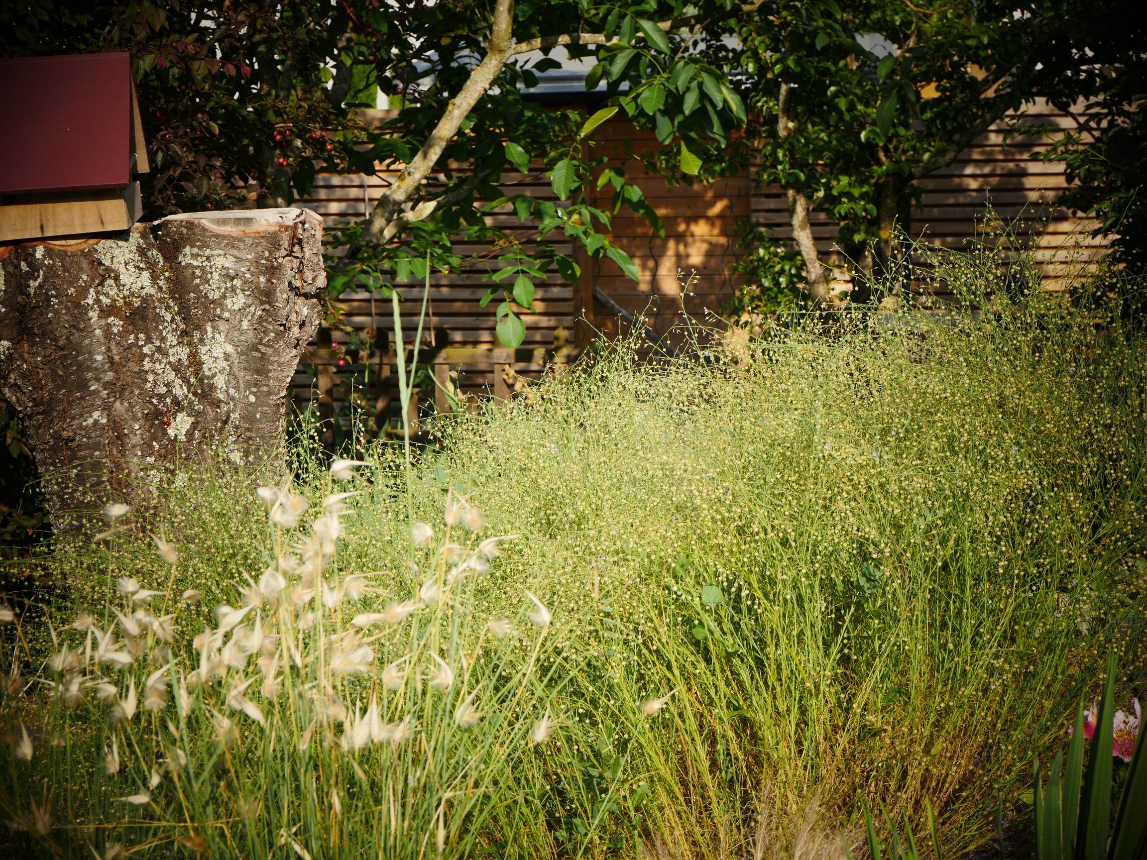 Perchée en haut du terrain, la maison domine ce jardin constitué de terrasses successives. La terrasse haute est simplement enherbée, cadrée par une arche végétalisée de rosiers. Dans ce même axe, un escalier d’ardoise permet d’atteindre en bas le verger palissé. Entre ces deux espaces, une rocaille d’ardoise accueille une végétation fleurie mellifère aux couleurs harmonieuses.