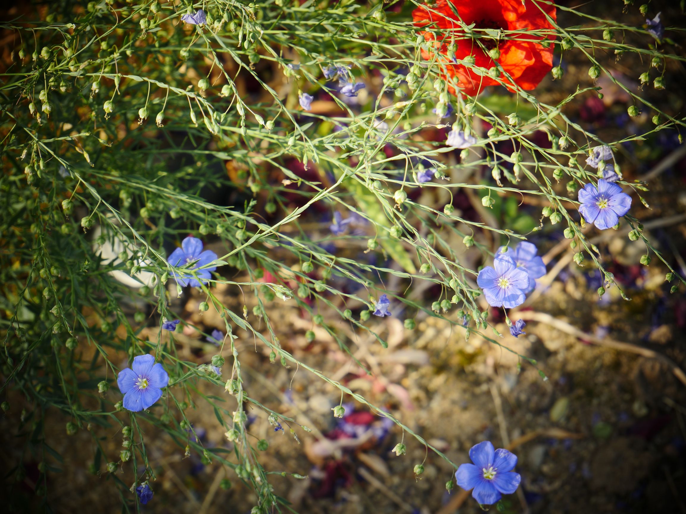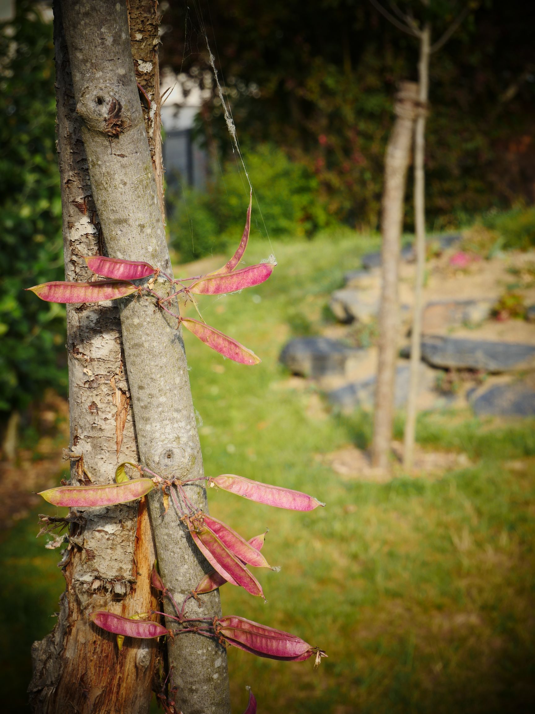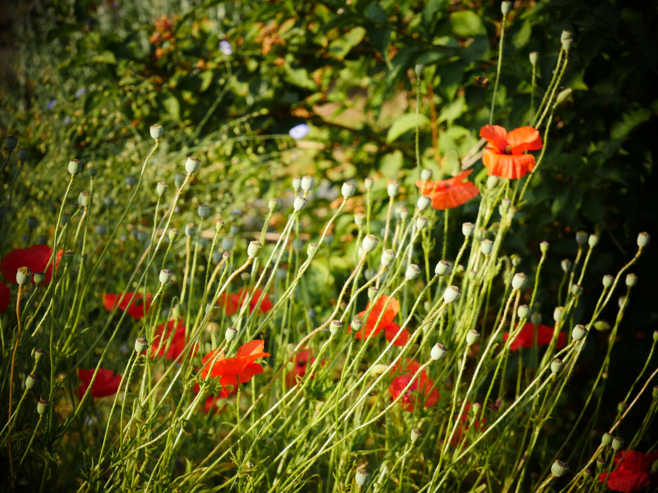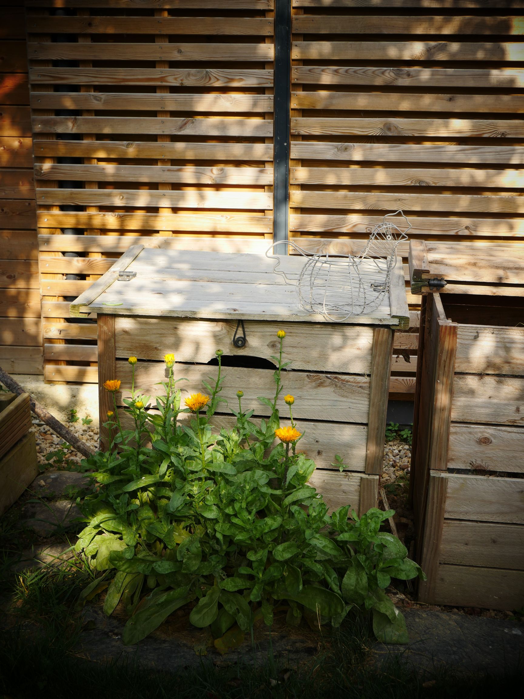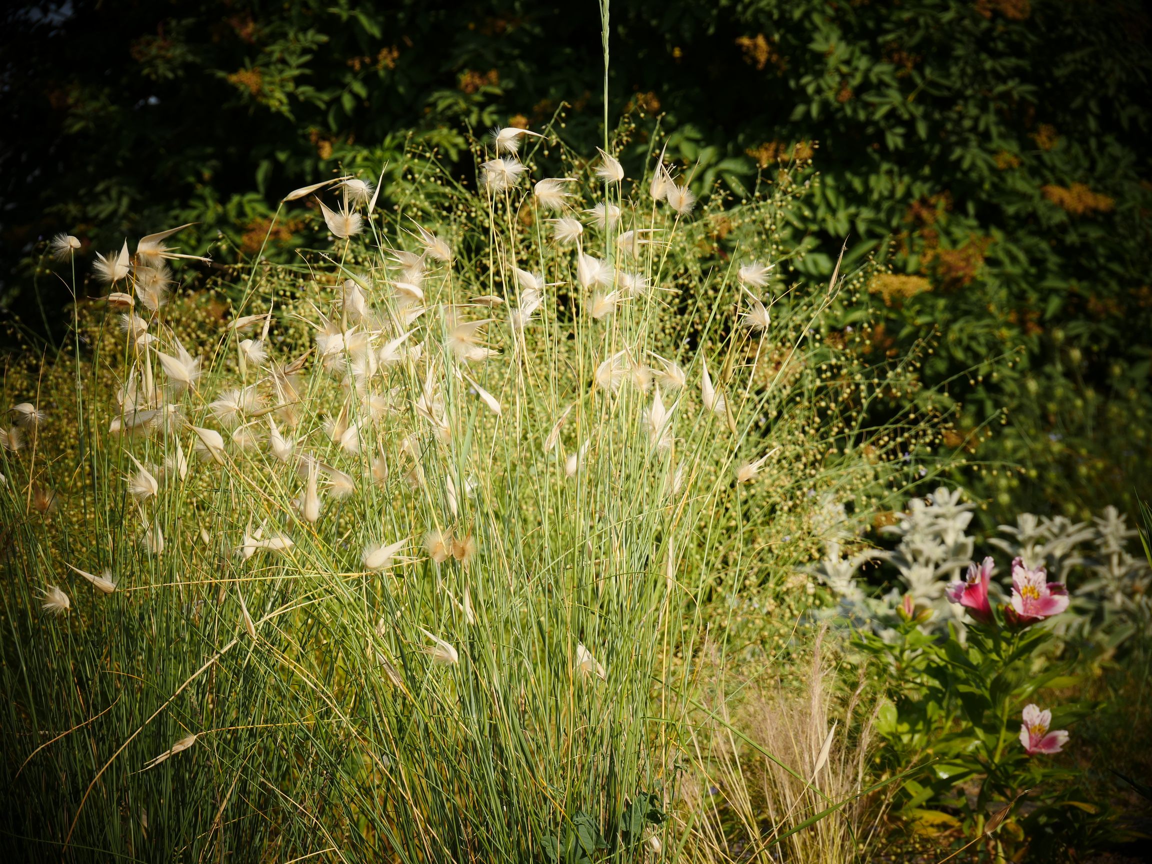 Perchée en haut du terrain, la maison domine ce jardin constitué de terrasses successives. La terrasse haute est simplement enherbée, cadrée par une arche végétalisée de rosiers. Dans ce même axe, un escalier d’ardoise permet d’atteindre en bas le verger palissé. Entre ces deux espaces, une rocaille d’ardoise accueille une végétation fleurie mellifère aux couleurs harmonieuses.