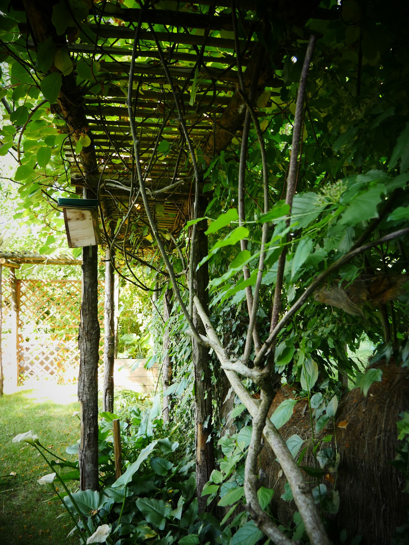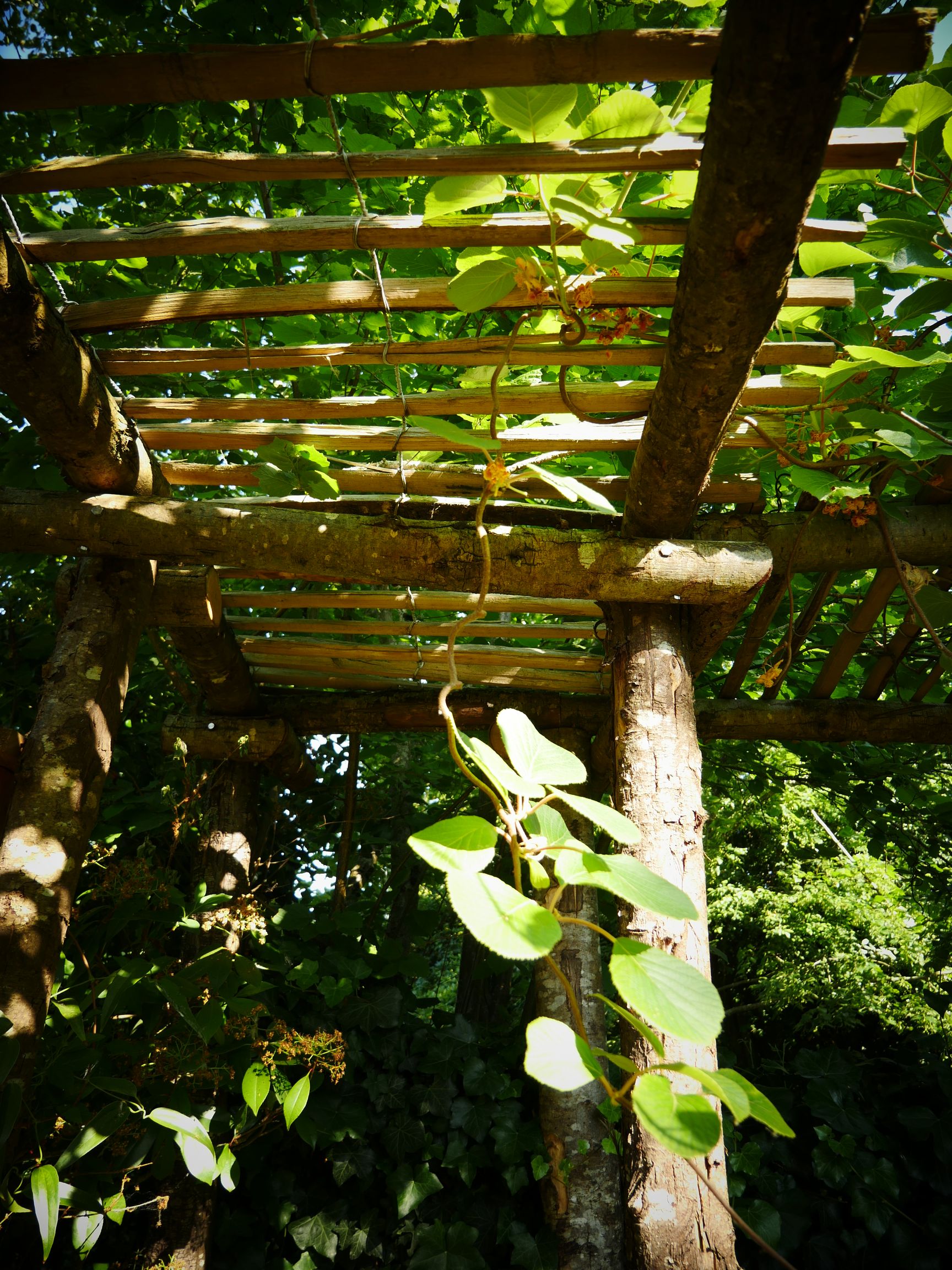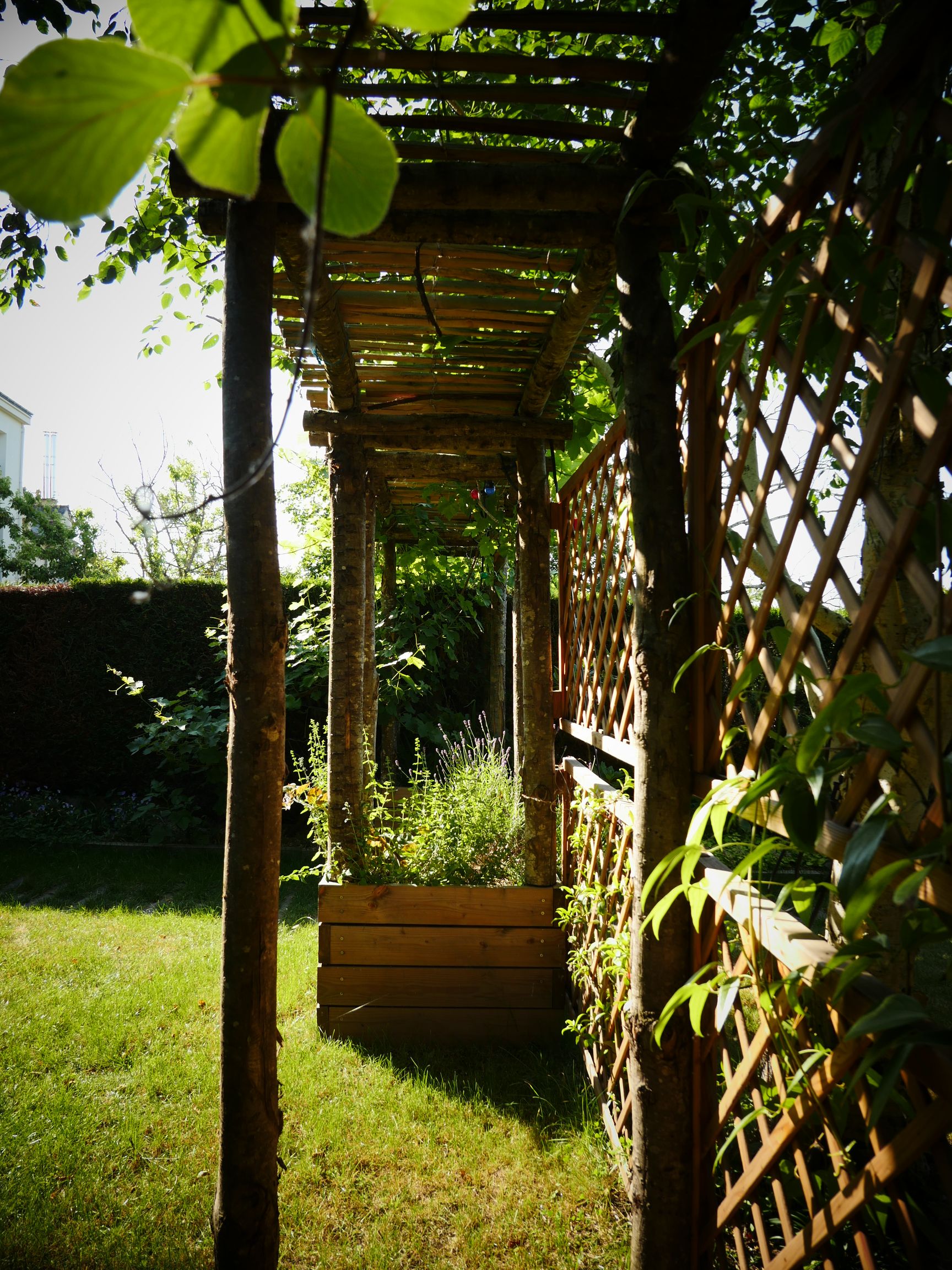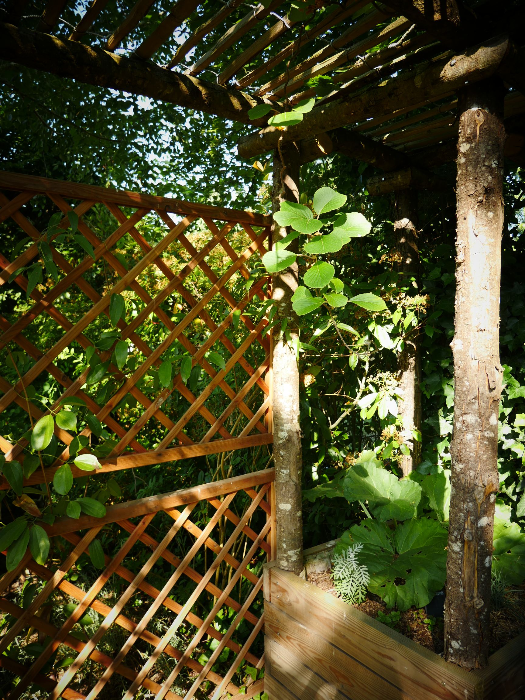 Support de kiwis, elle compose deux espaces distincts. Le premier est ouvert et accueille la végétation fleurie et comestible. Le second est intime avec le petit espace de baignade qui se loge dans une végétation plus dense.