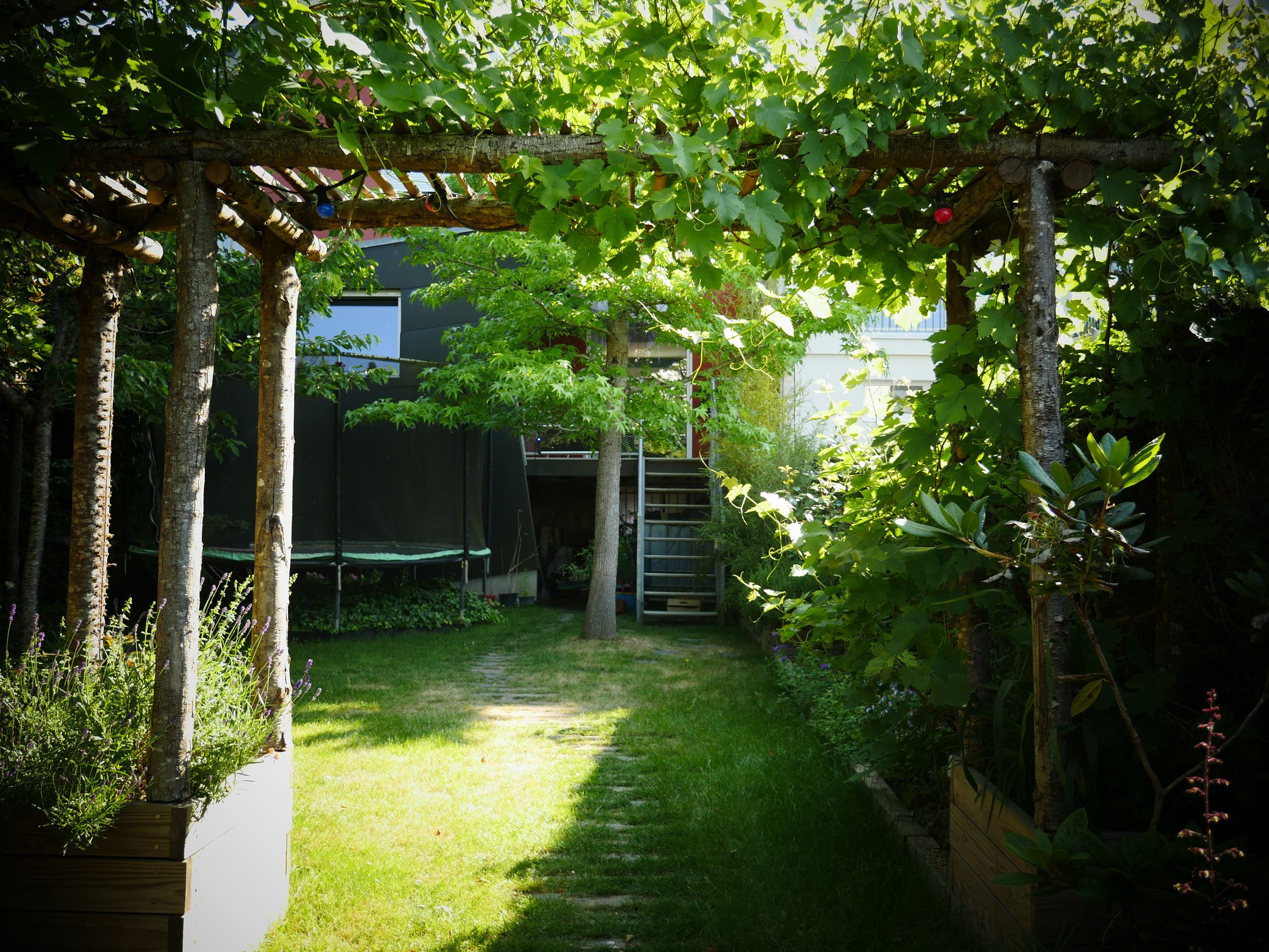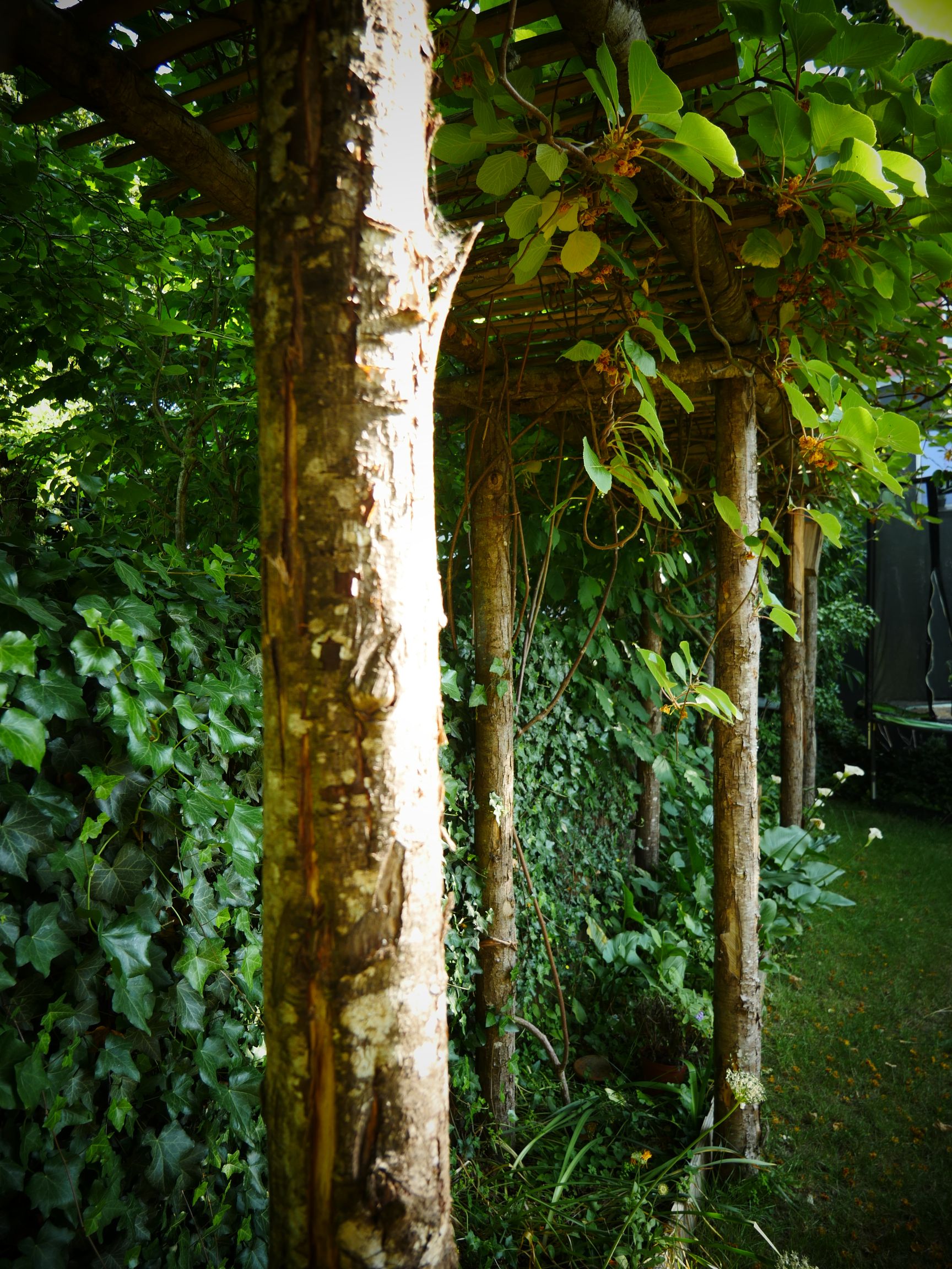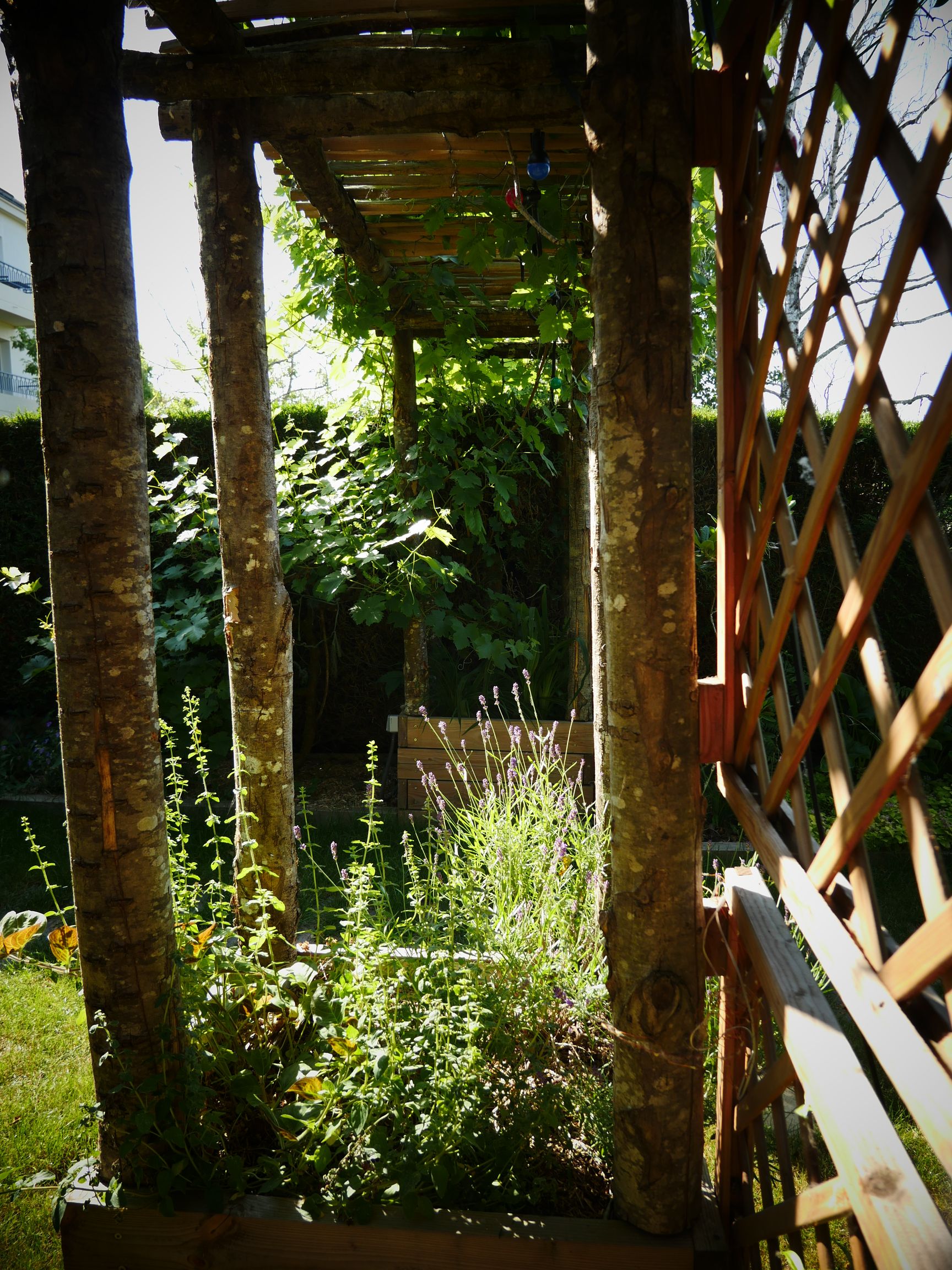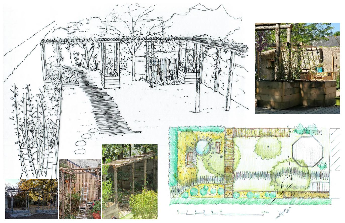 Support de kiwis, elle compose deux espaces distincts. Le premier est ouvert et accueille la végétation fleurie et comestible. Le second est intime avec le petit espace de baignade qui se loge dans une végétation plus dense.