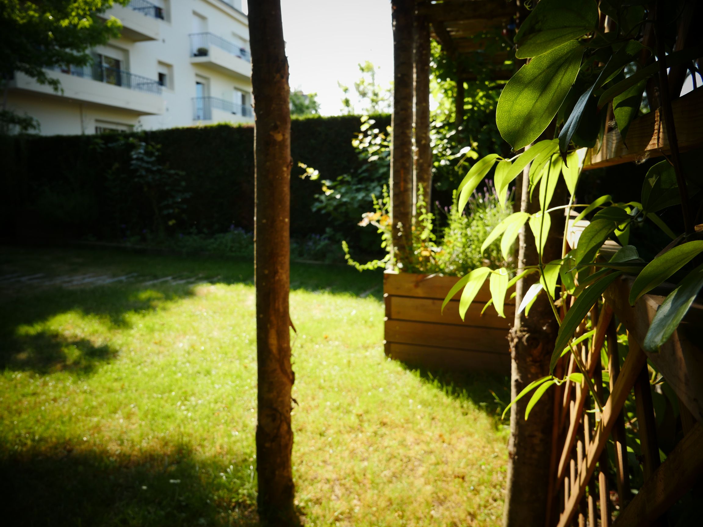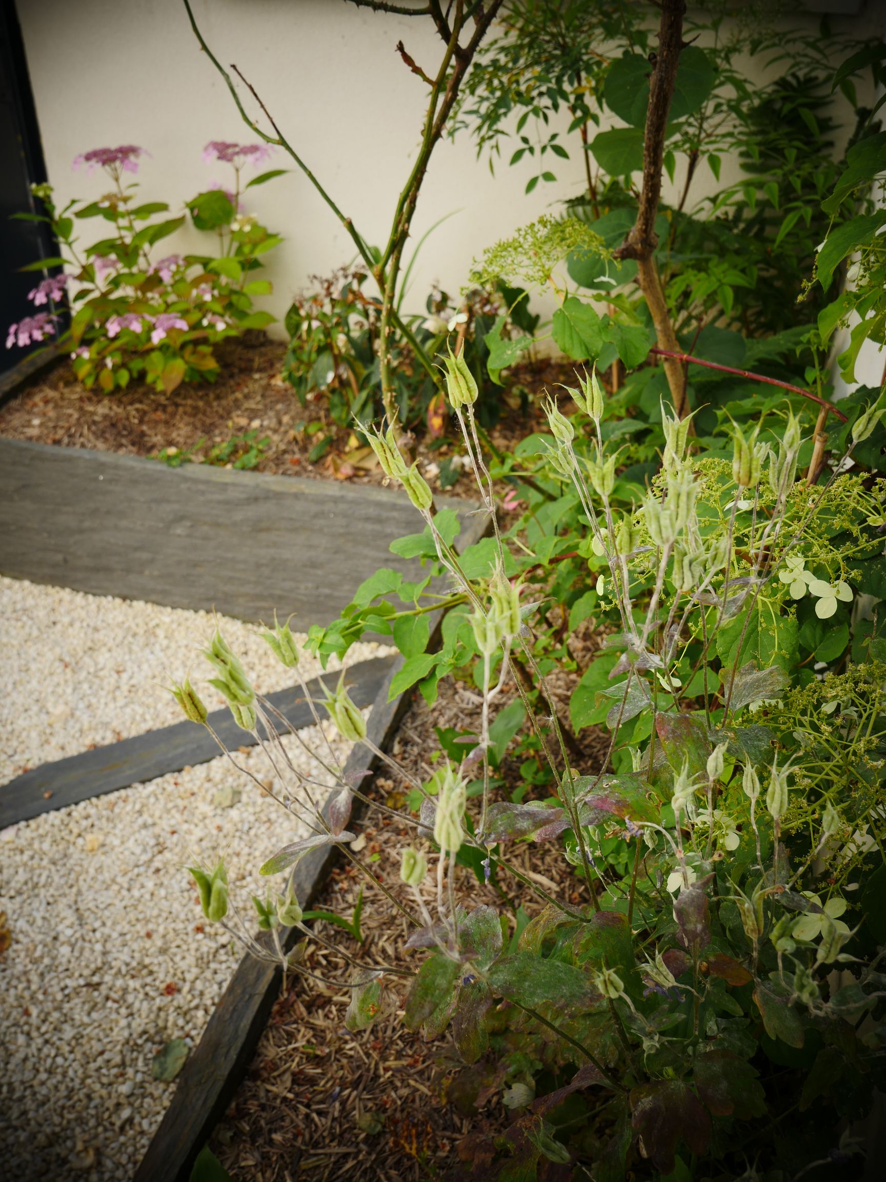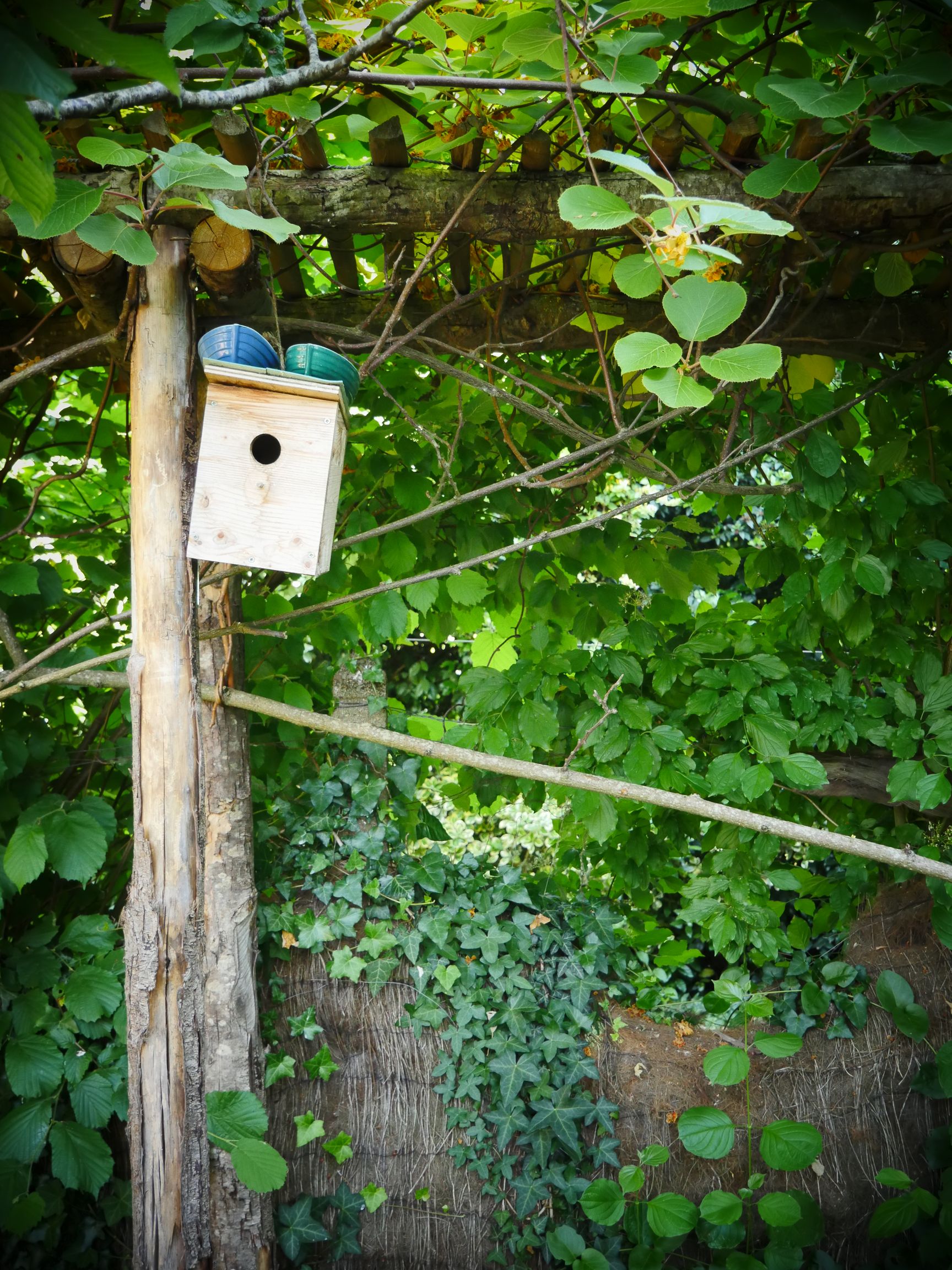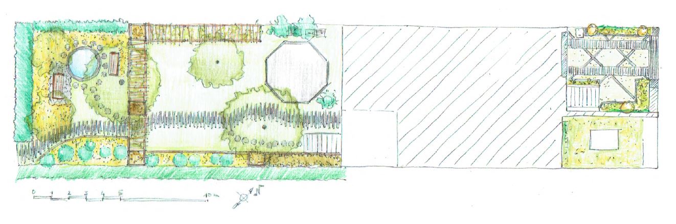 Support de kiwis, elle compose deux espaces distincts. Le premier est ouvert et accueille la végétation fleurie et comestible. Le second est intime avec le petit espace de baignade qui se loge dans une végétation plus dense.