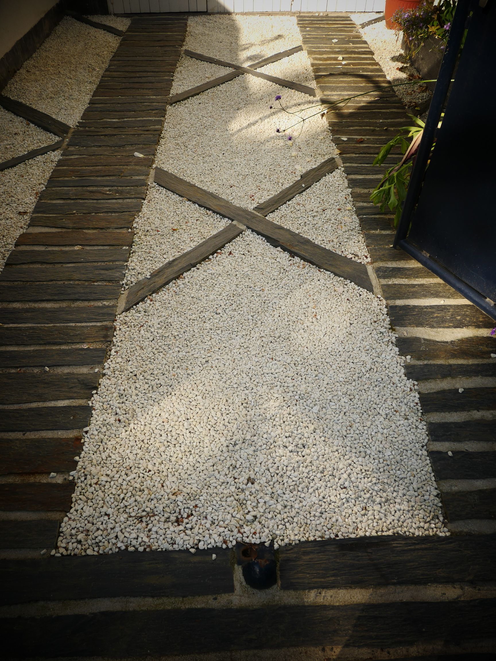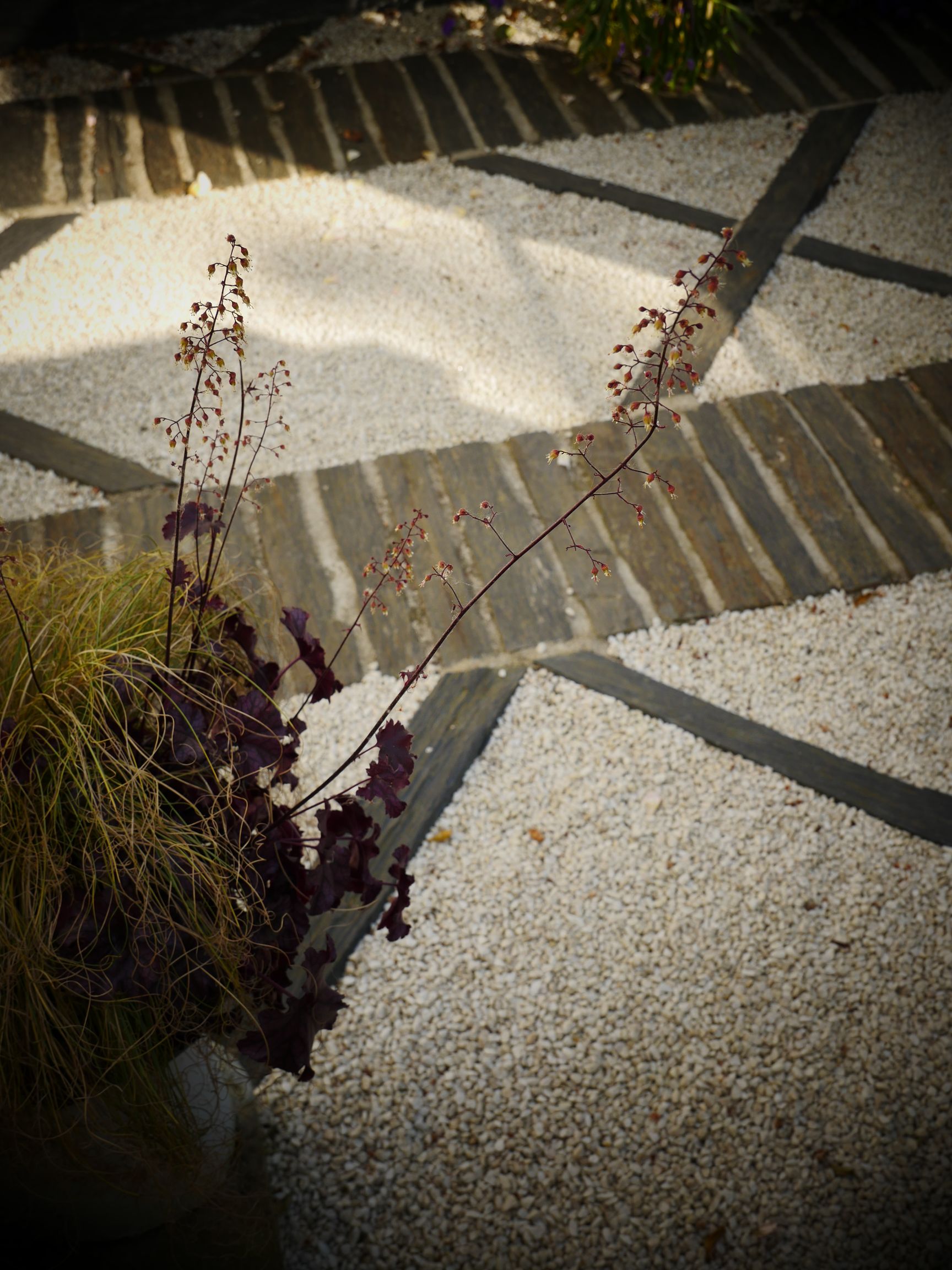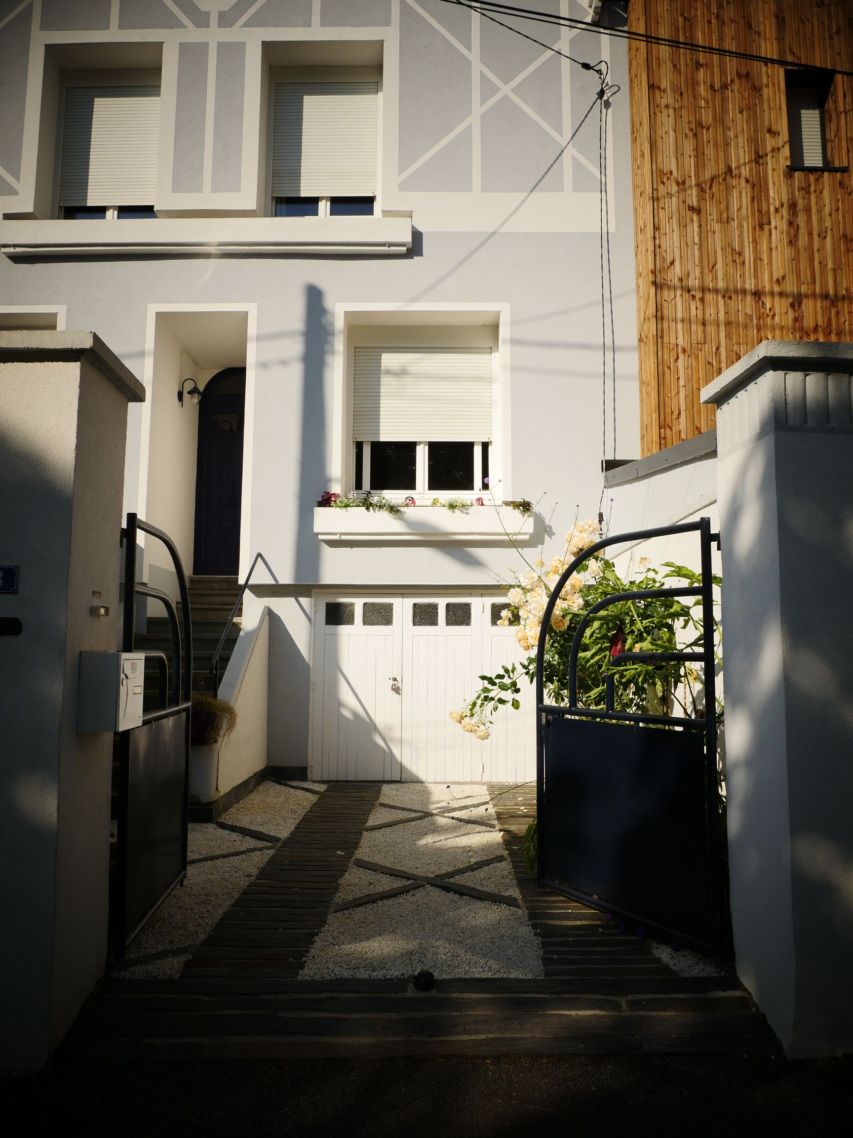 A l’avant de la maison, la composition plus minérale renvoie aux motifs géométriques de la façade.