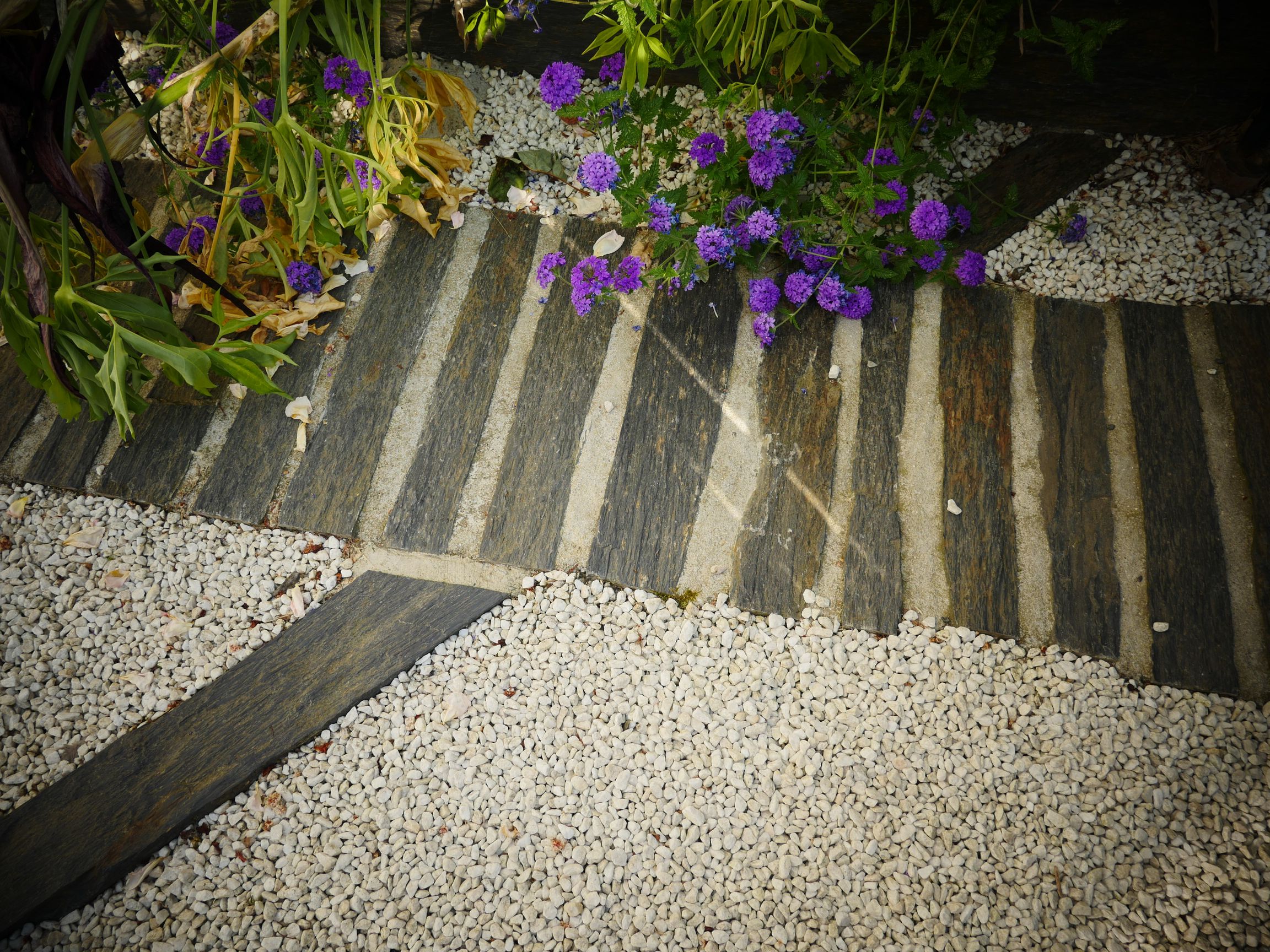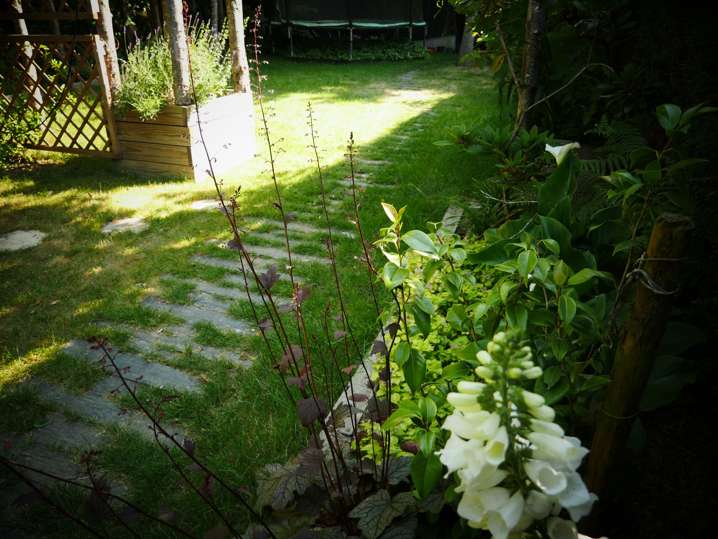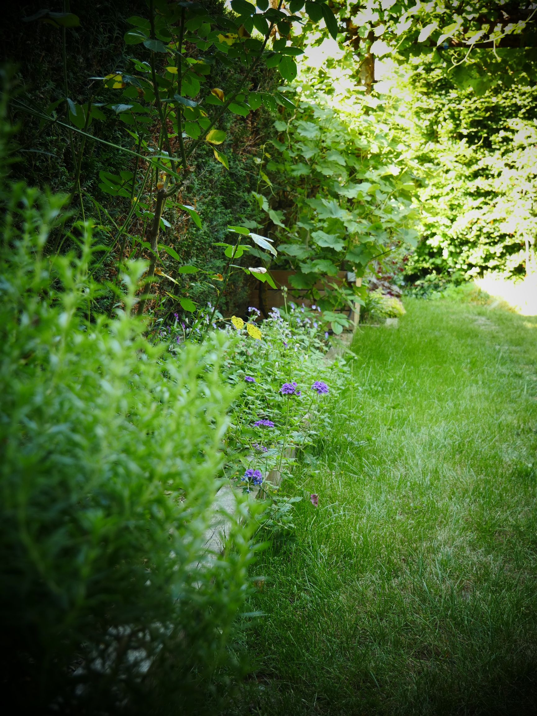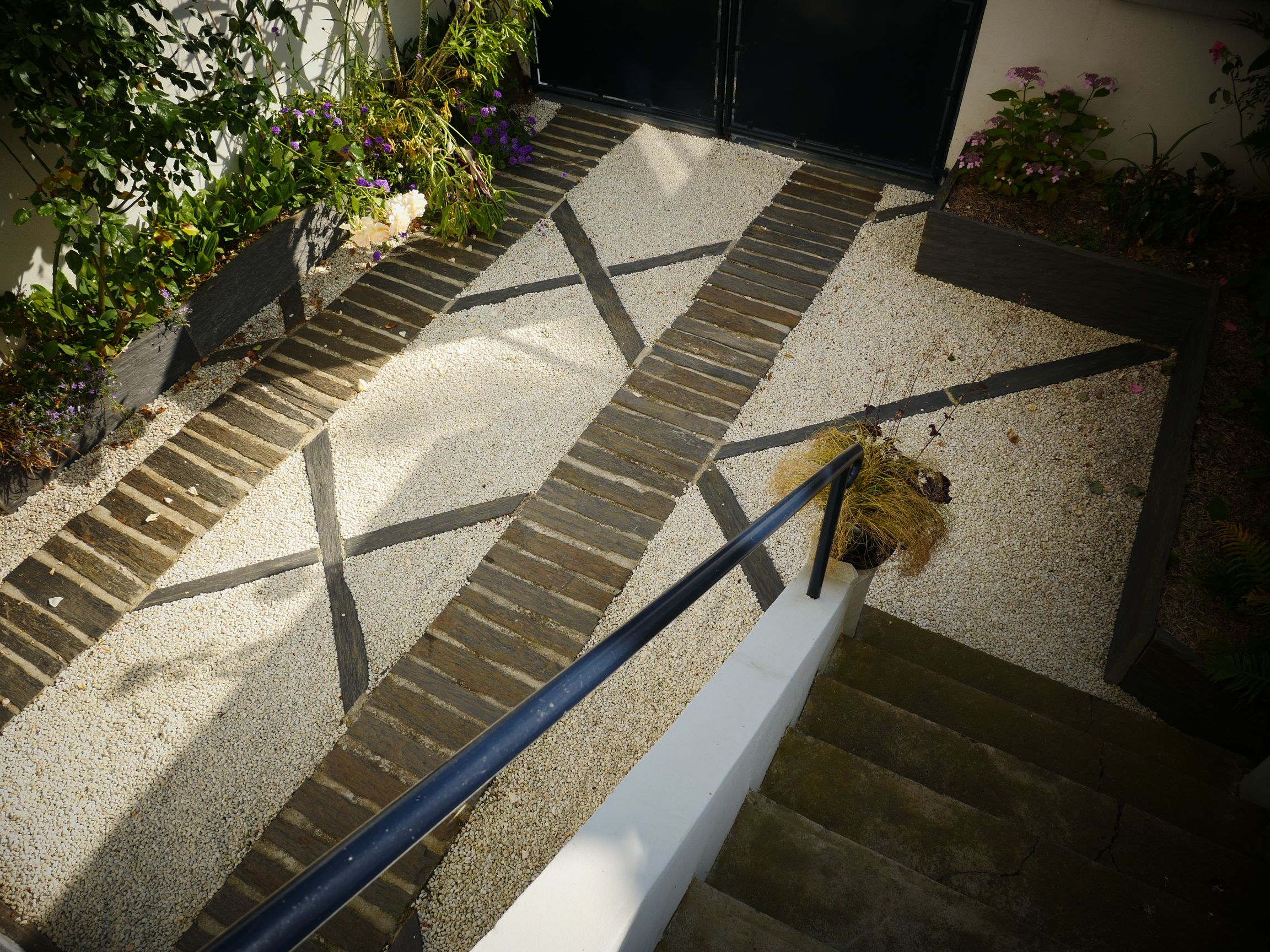 L’allée en piquets d’ardoise serpente à travers ces deux jardins d’agrément pour atteindre au fond le potager familial.