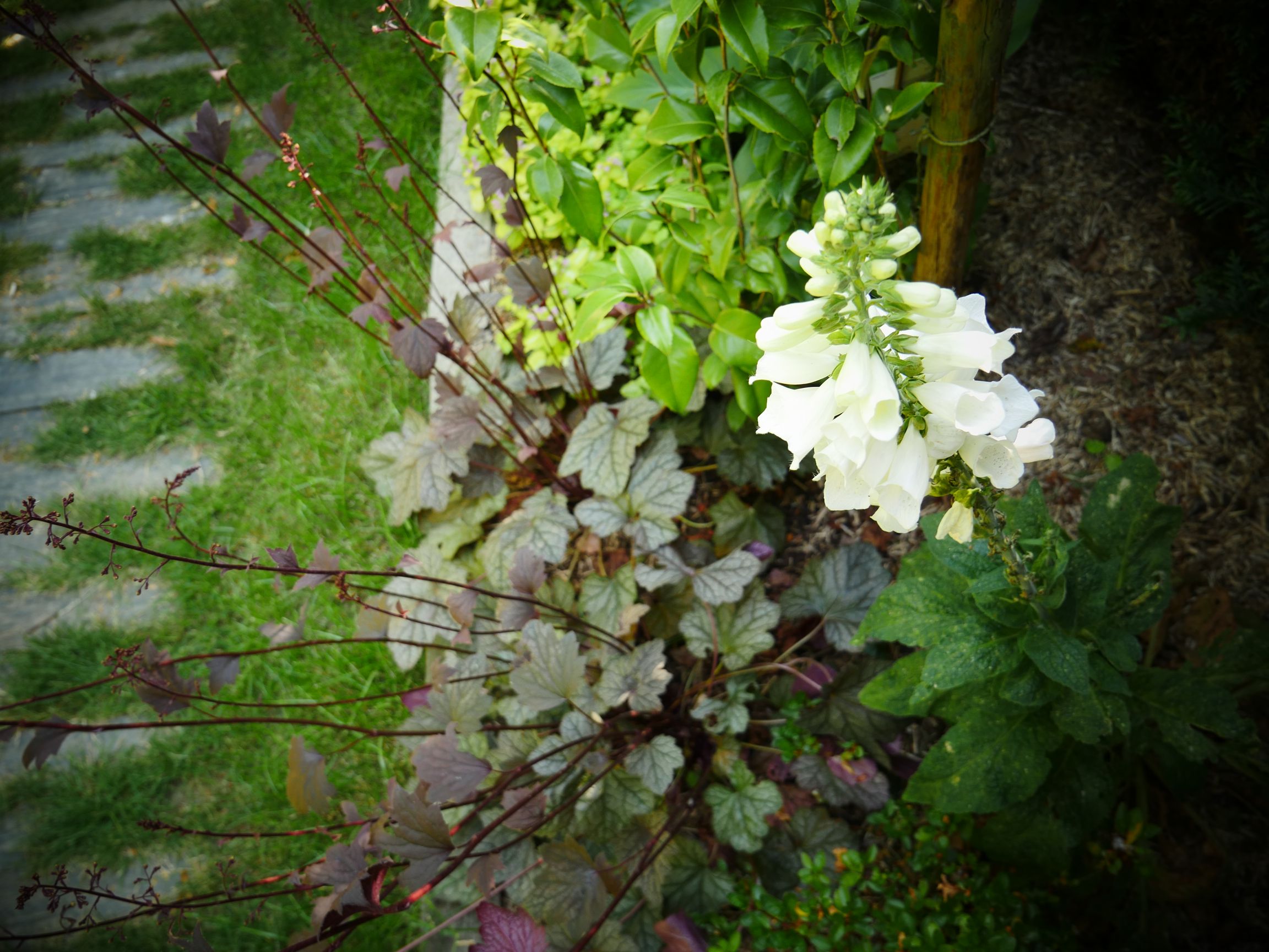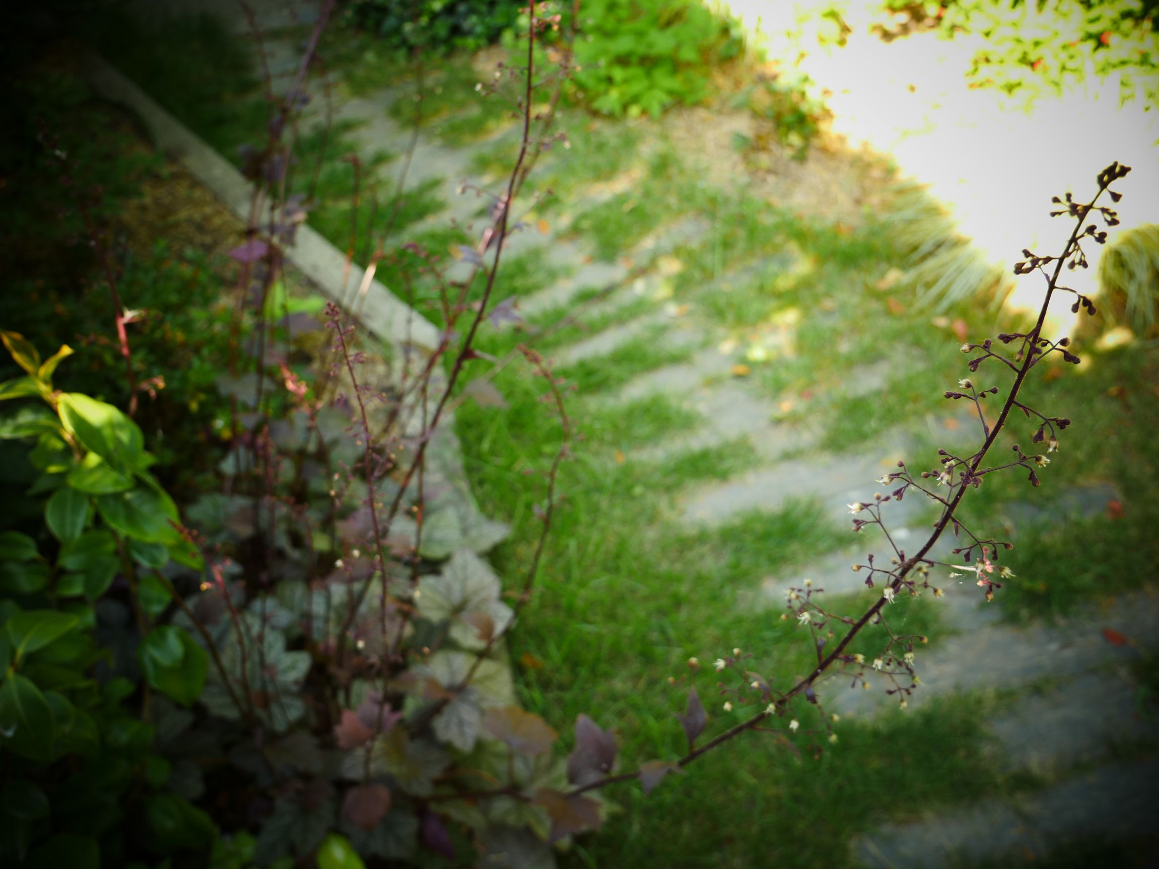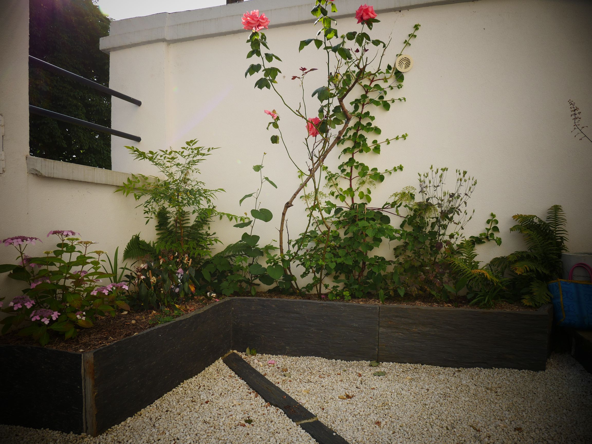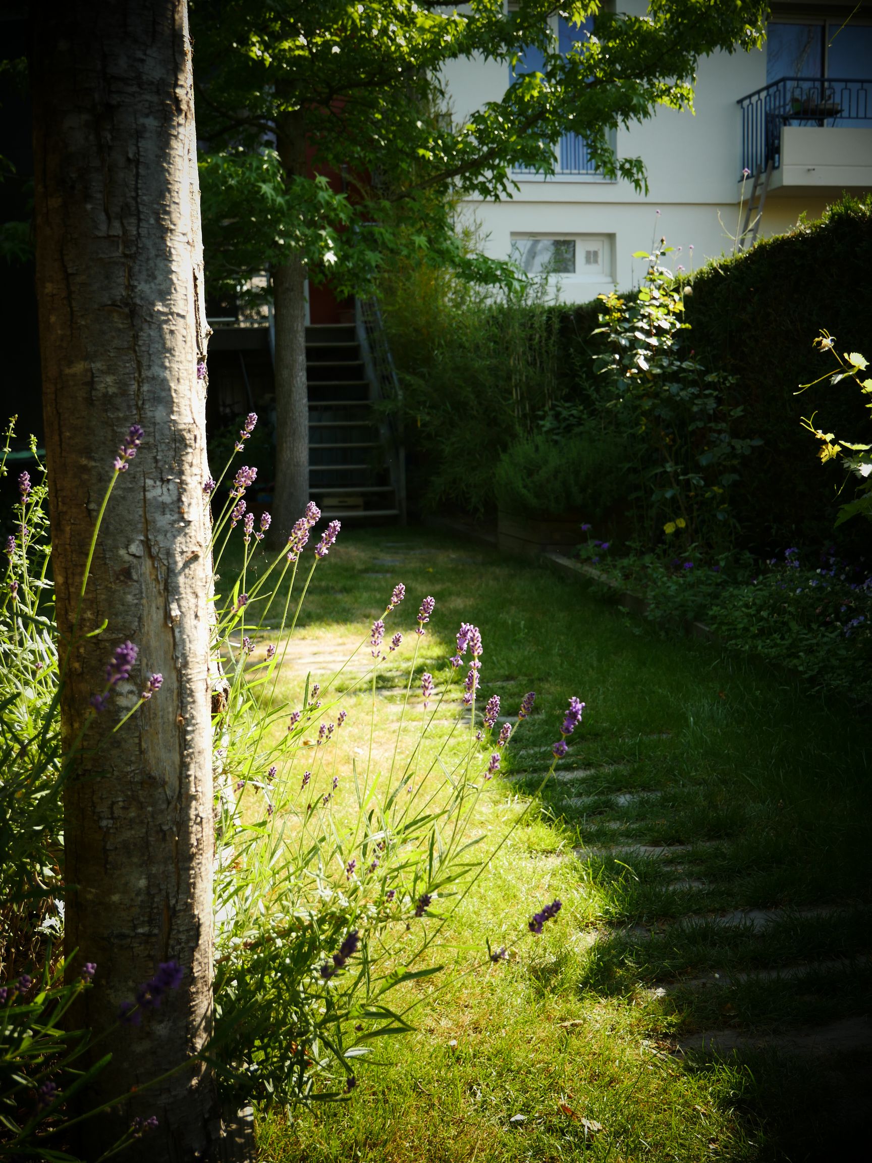 L’allée en piquets d’ardoise serpente à travers ces deux jardins d’agrément pour atteindre au fond le potager familial.