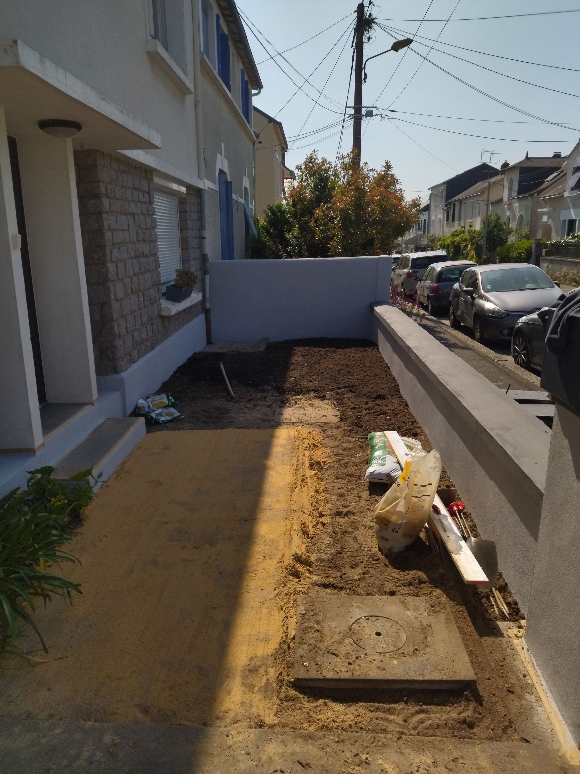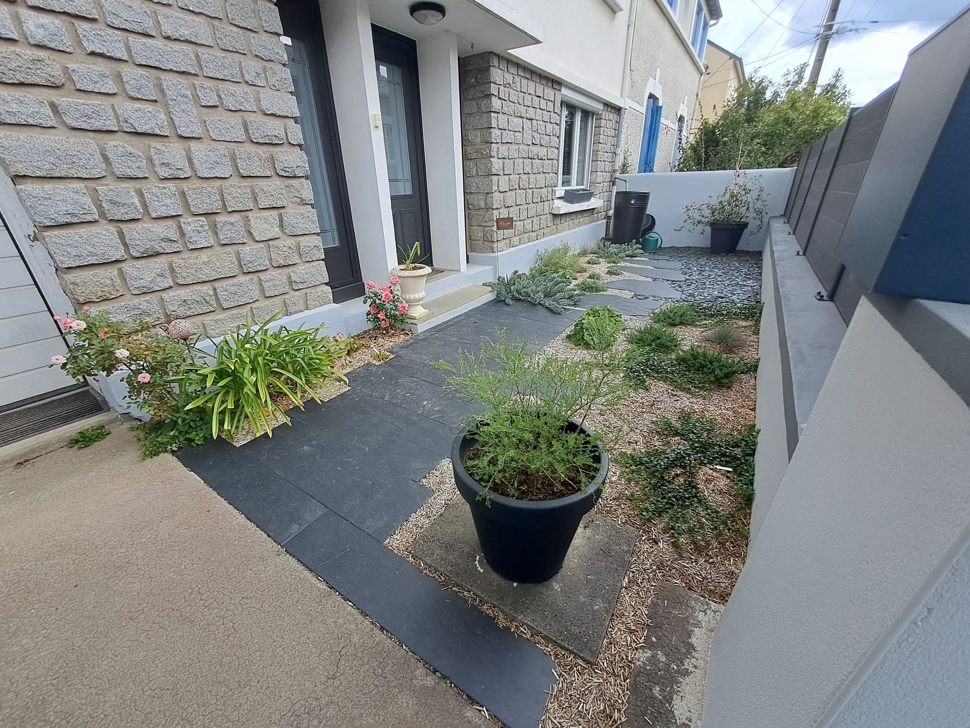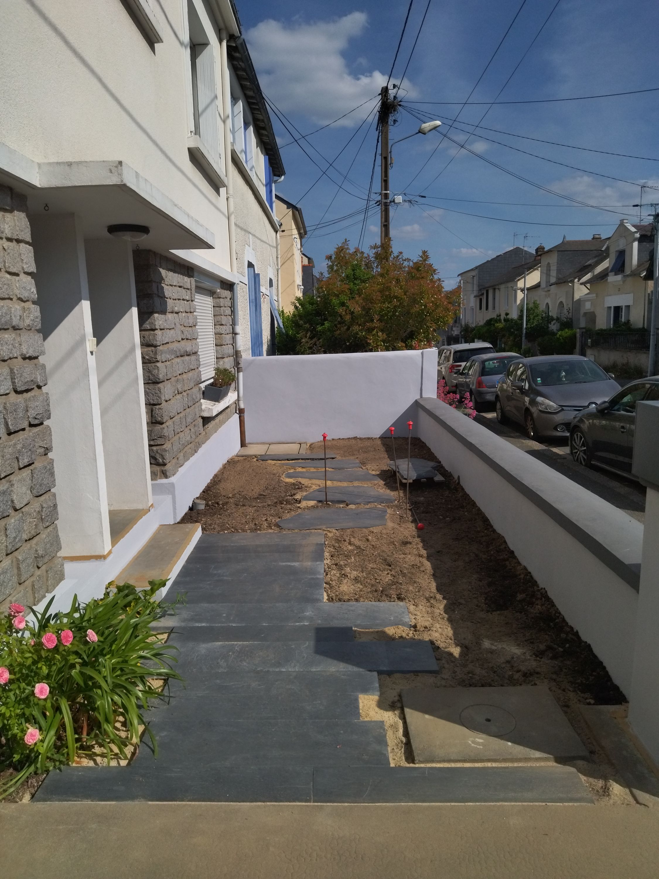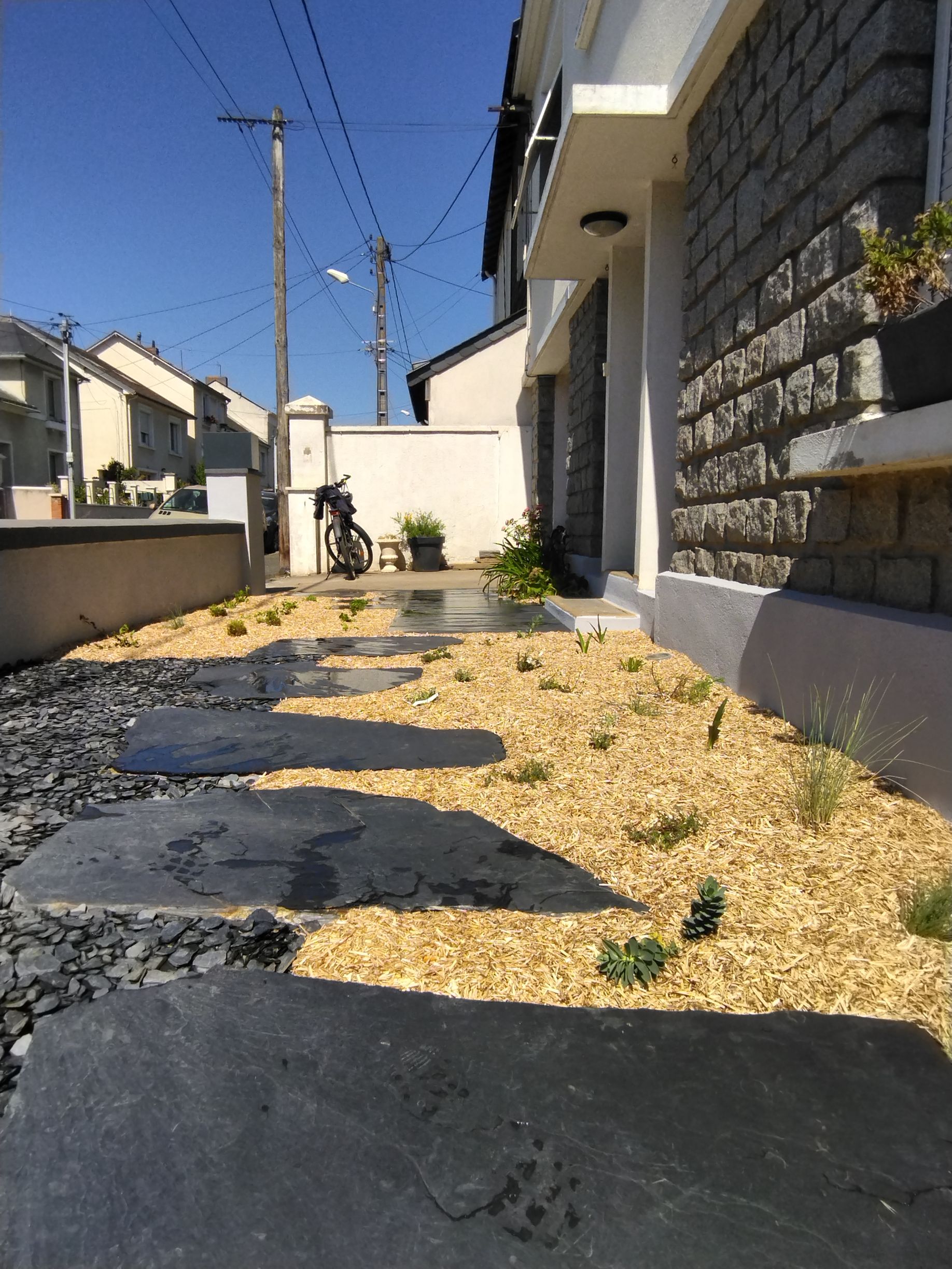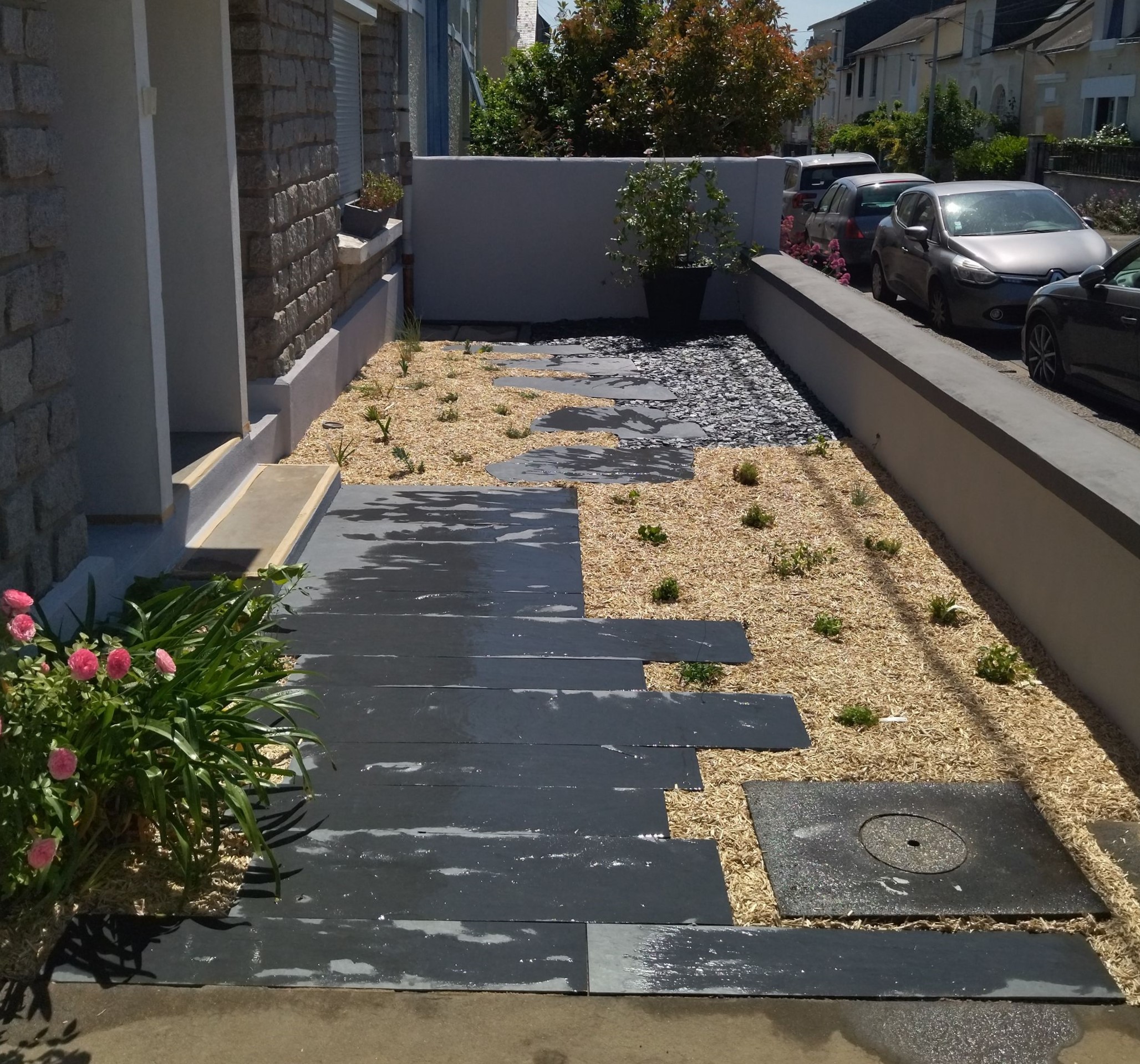 Mise en œuvre d’un dallage et pas japonais ardoise sur sable.