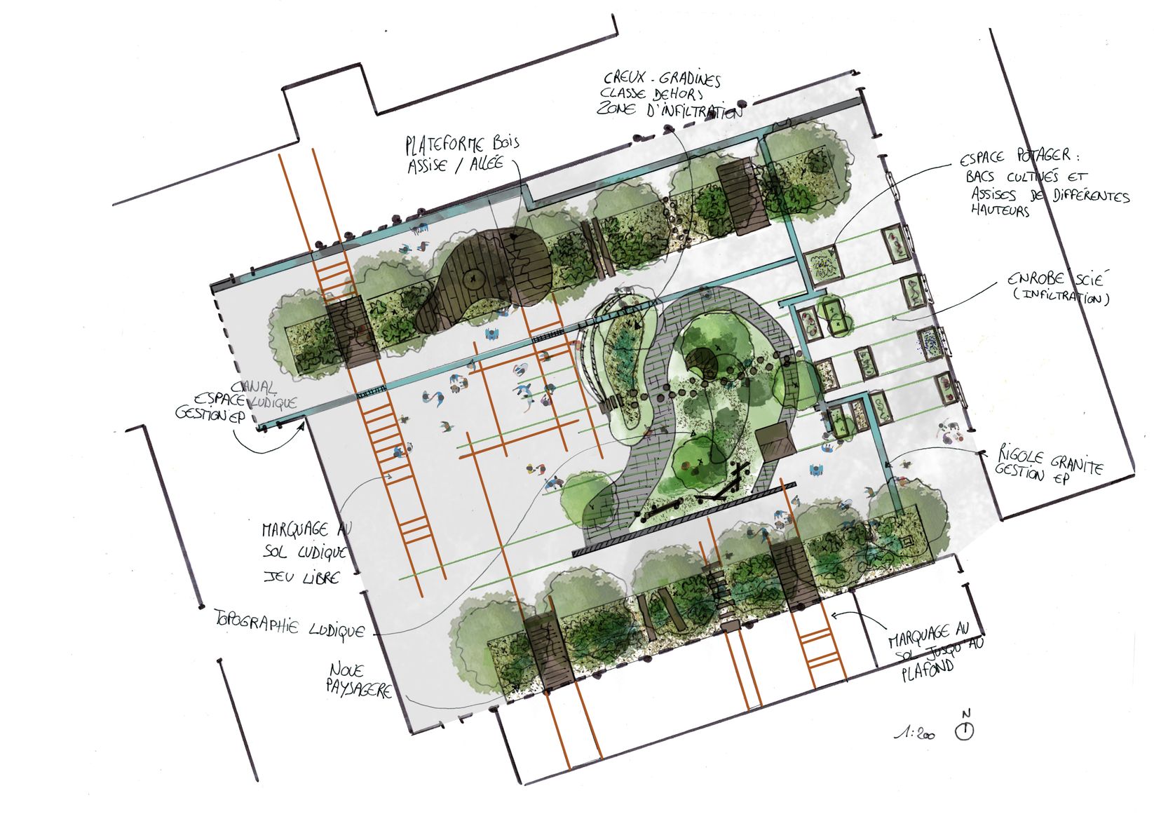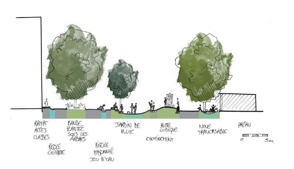tout en maximisant l’ombrage naturel et la fraicheur pour les usagers de la cour.