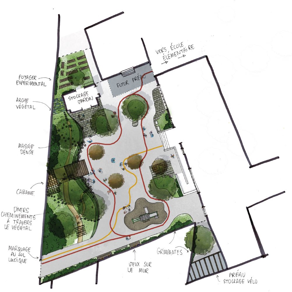 Le réaménagement général de la cour est l’occasion de repenser ces espaces extérieurs, autant comme des lieux de partage, d’expérimentation, d’apprentissage que la salle de classe, de nombreuses demandes ont été formulées lors de la concertation préalable au projet.